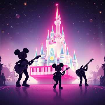 A high-energy glam-rock Disney parade anthem with pounding arena drums, bright 80s electric guitars, and a glitter-soaked synth lead driving the melody, The sound is big, bold, and theatrical—perfect for a night parade with fireworks bursting overhead, The beat stays fast and foot-thumping, built for crowd movement and call-and-response moments, Vocals are powerful, uplifting, confident, with harmonised gang-shouts in the chorus to give it that festival roar, The music blends triumphant magic-themed Disney melodies with neon-lit 80s glam swagger: huge power chords, shimmering pads, and explosive keytar-style riffs, The tone is joyful, adventurous, and larger than life, like a celebration marching straight through a city of lights, Everything should feel like pure spectacle—anthemic, sparkling, and ready to shake an entire parade route