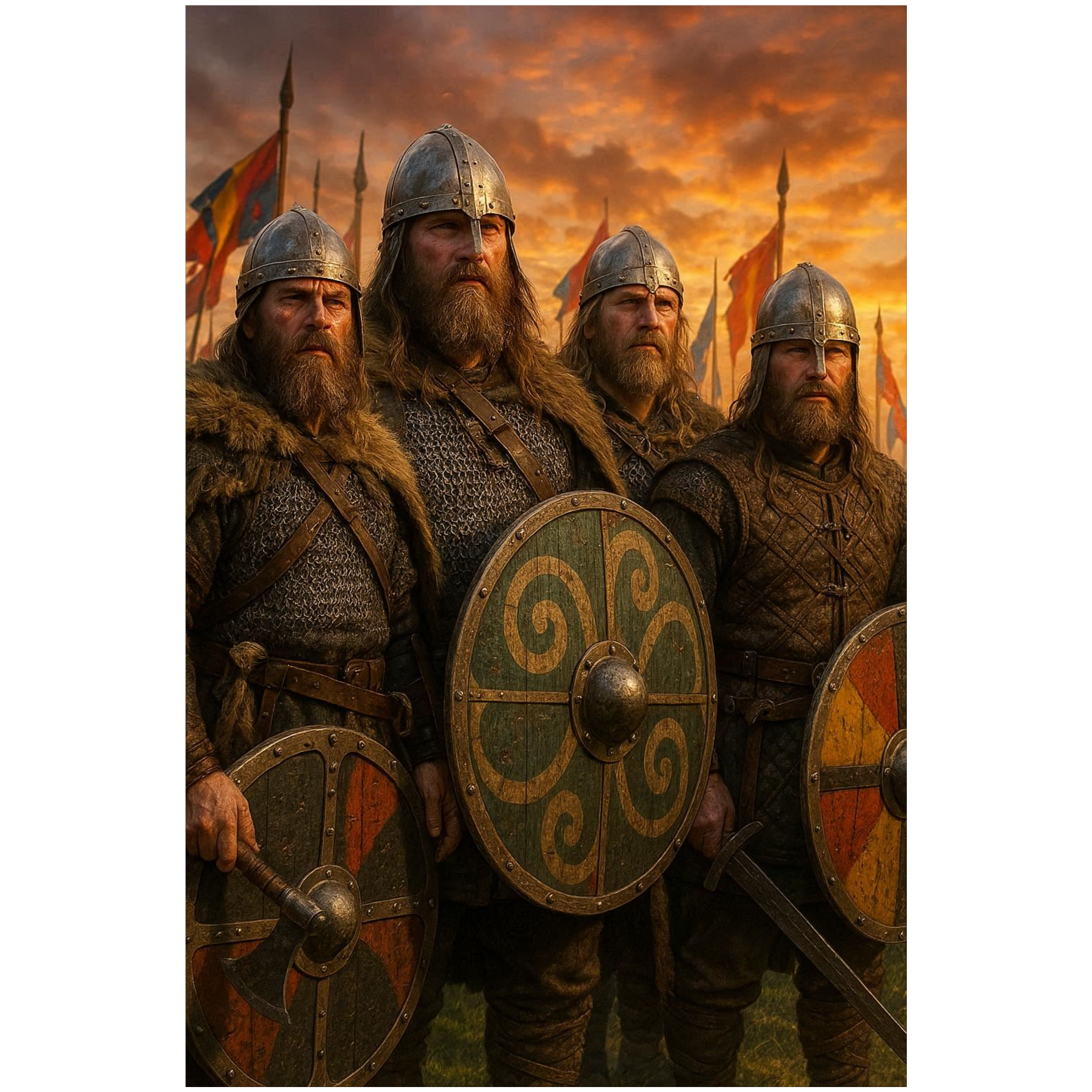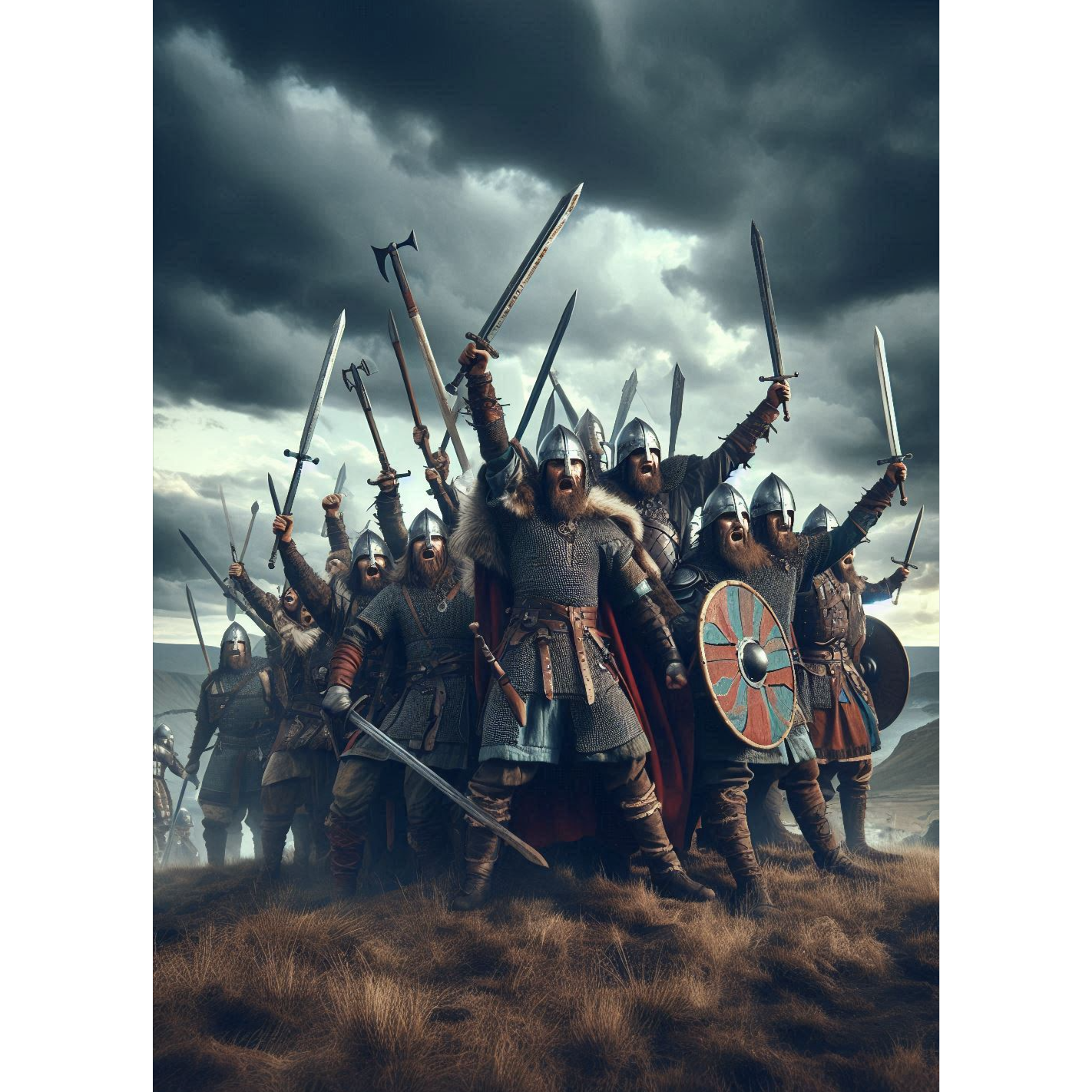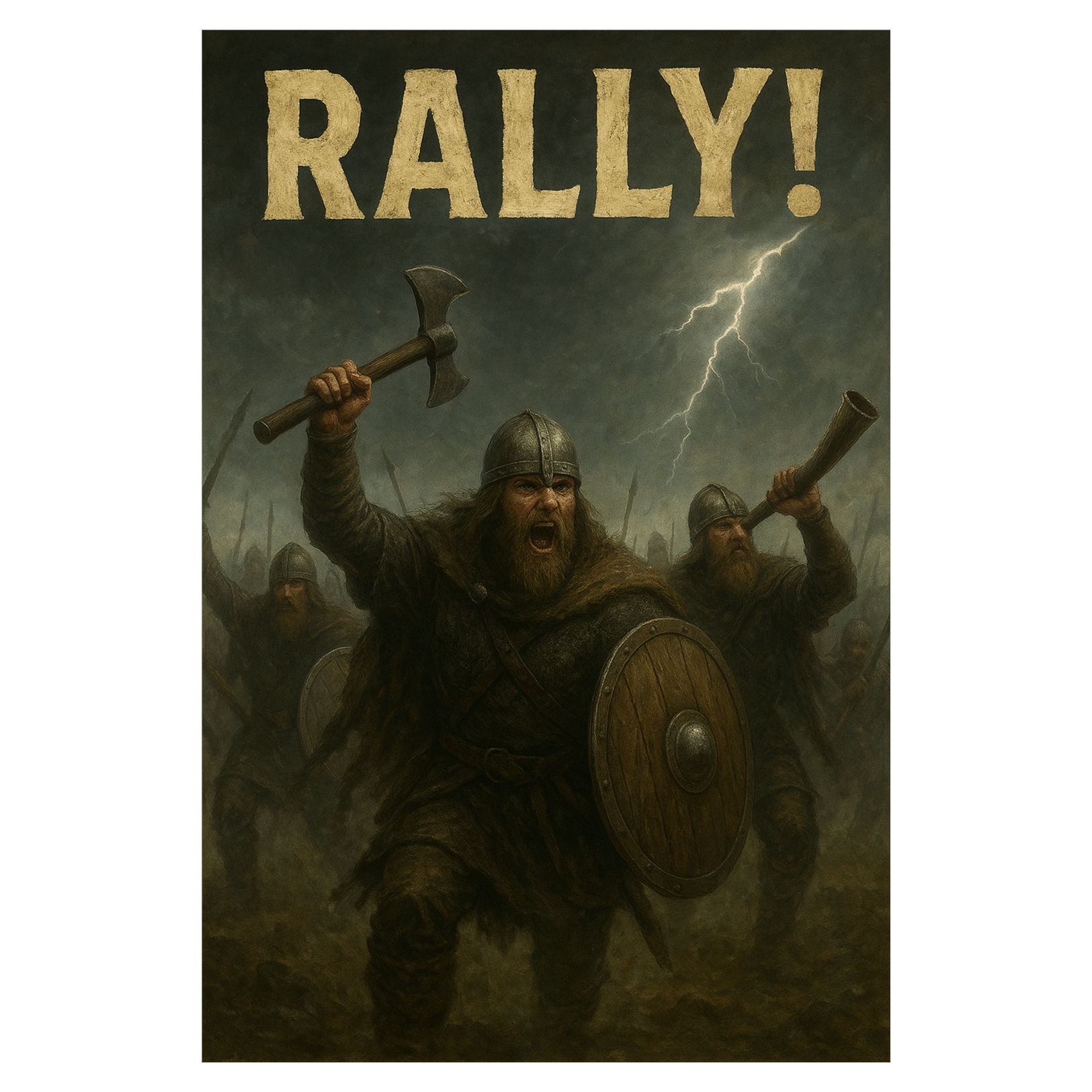 Tempo: 145 bpm, Key: D minor, EDM warzone vibe, Intro opens with a deep Viking horn stretched and distorted into a rising synth lead, layered over a pulsing kick drum (4-on-the-floor), Build section brings in rolling toms (Viking war drum samples blended with electronic percussion), high-energy risers, and glitchy string stabs, Drop explodes with sidechained synth bass, distorted orchestral hits, layered chants of “Rally! Rally!” repeating with reverb, Verses use sharp techno plucks with minimal drums, then build tension with snare rolls and risers, Choruses drop hard with war horns, choir-like pads, and relentless kick/bass, Bridge strips to drums + horn sample with a filter sweep, then slams into final massive drop with heavy synth layers and chopped vocal shouts, Outro fades with a fading horn and kick echoes