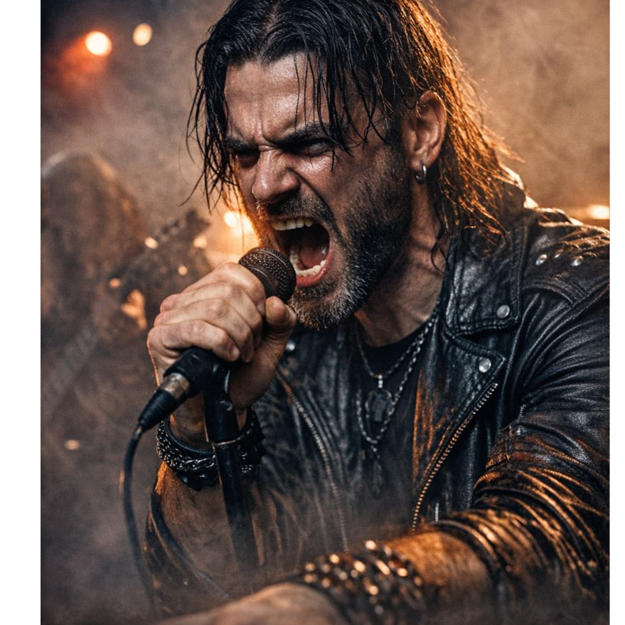 Strong, fierce male vocal — controlled grit, clear lyrics, no growling, Shouted gang vocals or layered harmonies in the chorus for power, Structure builds tension → release: