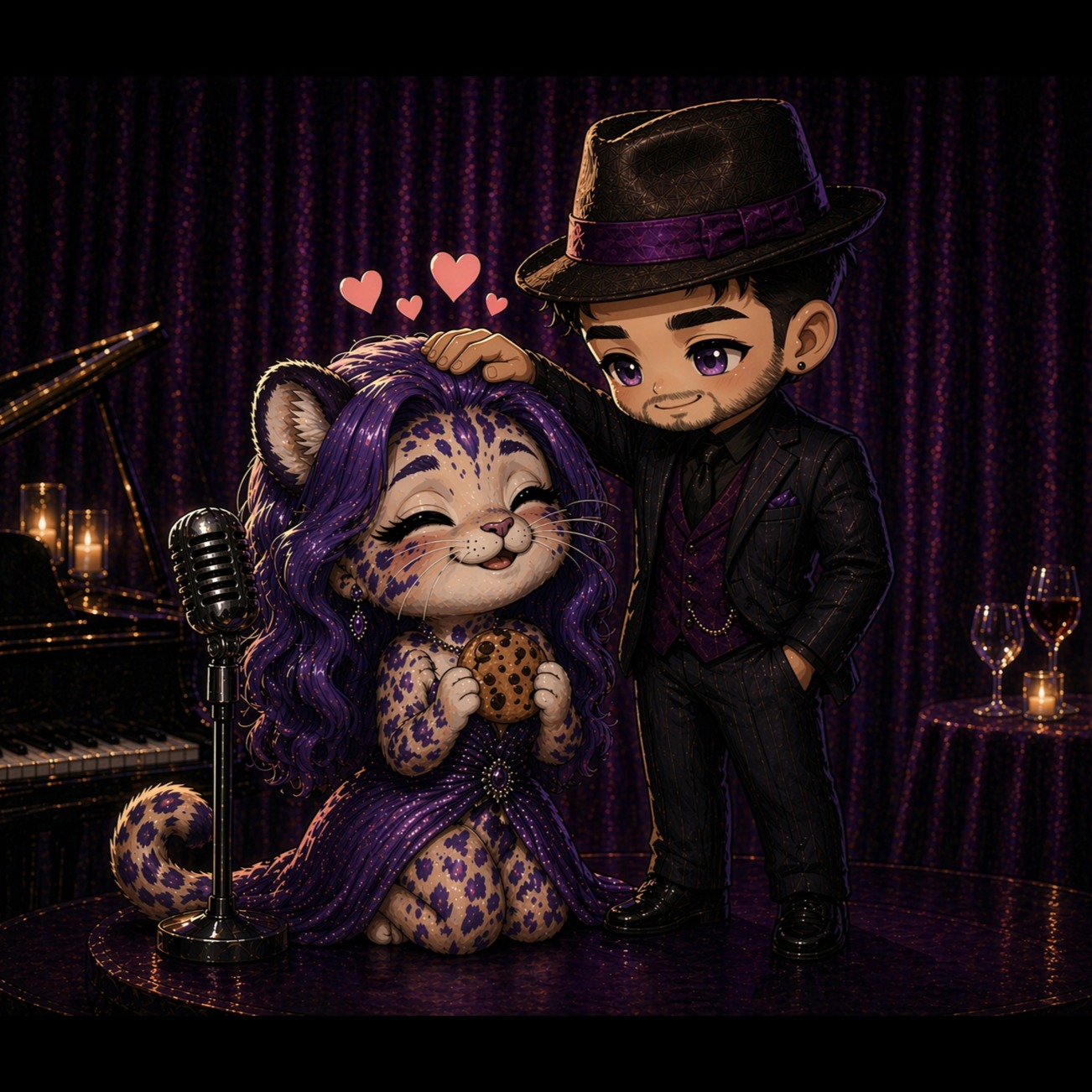 [theme: backstage romance, soft glamour, after-hours intimacy, star singer and quiet protector, velvet night magic, playful affection]