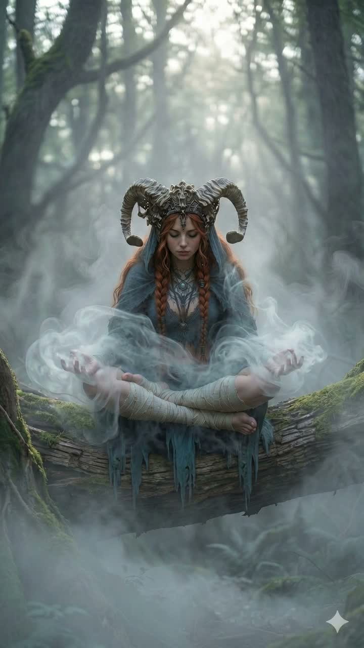 Dark Ritual Ambient tribal, Cinematic Drone, Polyrhythmic shifting tempo, INSTRUMENTS: Slow E-bow alto electric guitar swells, Gritty Tagelharpa low drone, Deep Shamanic Frame Drum sub-bass pulse, Bone rattles, VOCALS: The voice is front and raw—feminine, clear yet quivering—cut with nasal edges and tremolo yodels that pierce through the mix, Harmonies swirl unpredictably, stacked in minor dissonance, fading into blown-out whispers