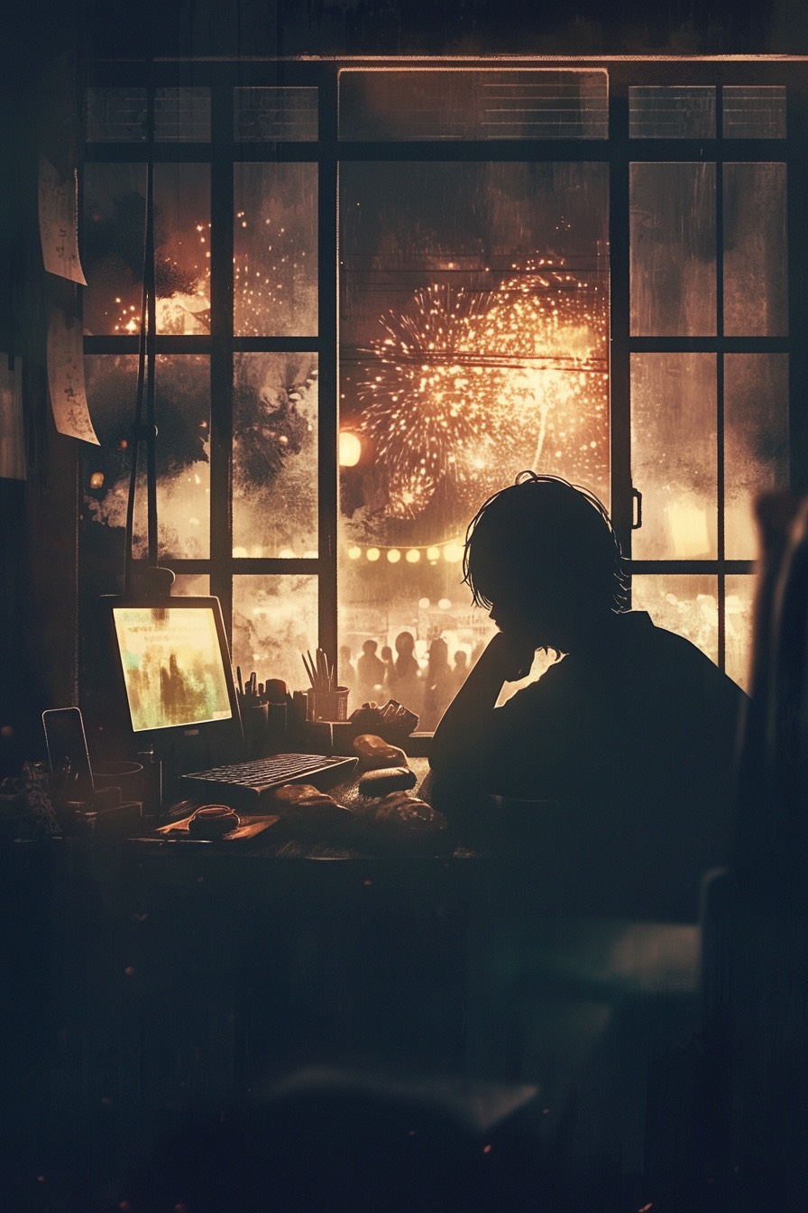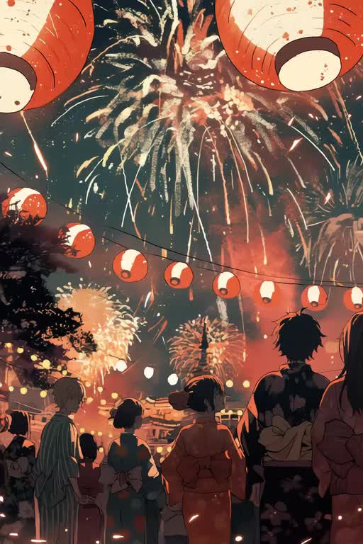 A Japanese alternative rock track that blends emotional storytelling with festival nostalgia, The sound draws from punchy post-hardcore intensity, intricate math-rock rhythms, experimental electro-pop textures, and bittersweet indie lyricism, Featuring driving guitars with a dry crunch, layered with atmospheric pads and traditional percussive motifs (evoking distant festival drums and firework rhythms), The vocals are in Japanese, with a blend of poetic introspection, tension, and release—shifting between whispered phrases and soaring melodic hooks, Inspired by the loneliness of staying indoors while the world celebrates outside, the song conveys longing, envy, and quiet acceptance, Blending emotional noise rock guitars with trap-influenced beats, a festival-style taiko rhythm pattern, and city pop-inspired synth backdrops, this track evolves dynamically toward a cathartic, fireworks-like final chorus