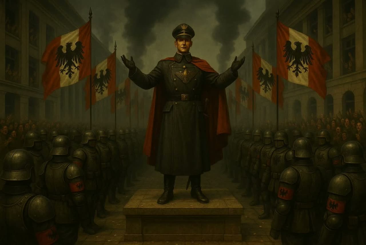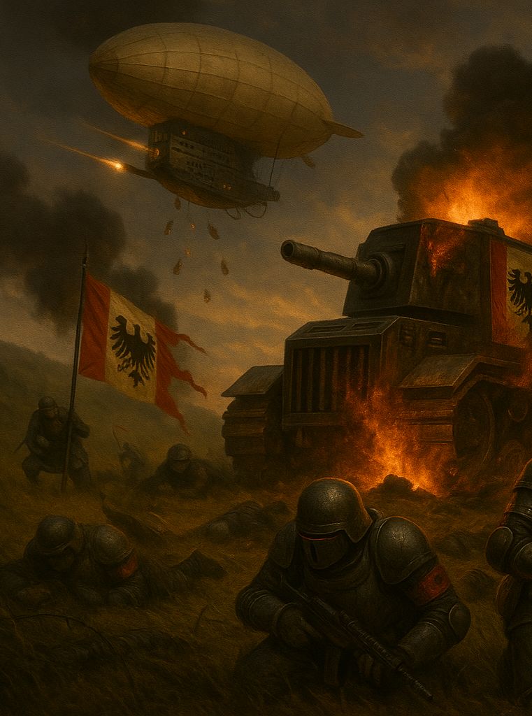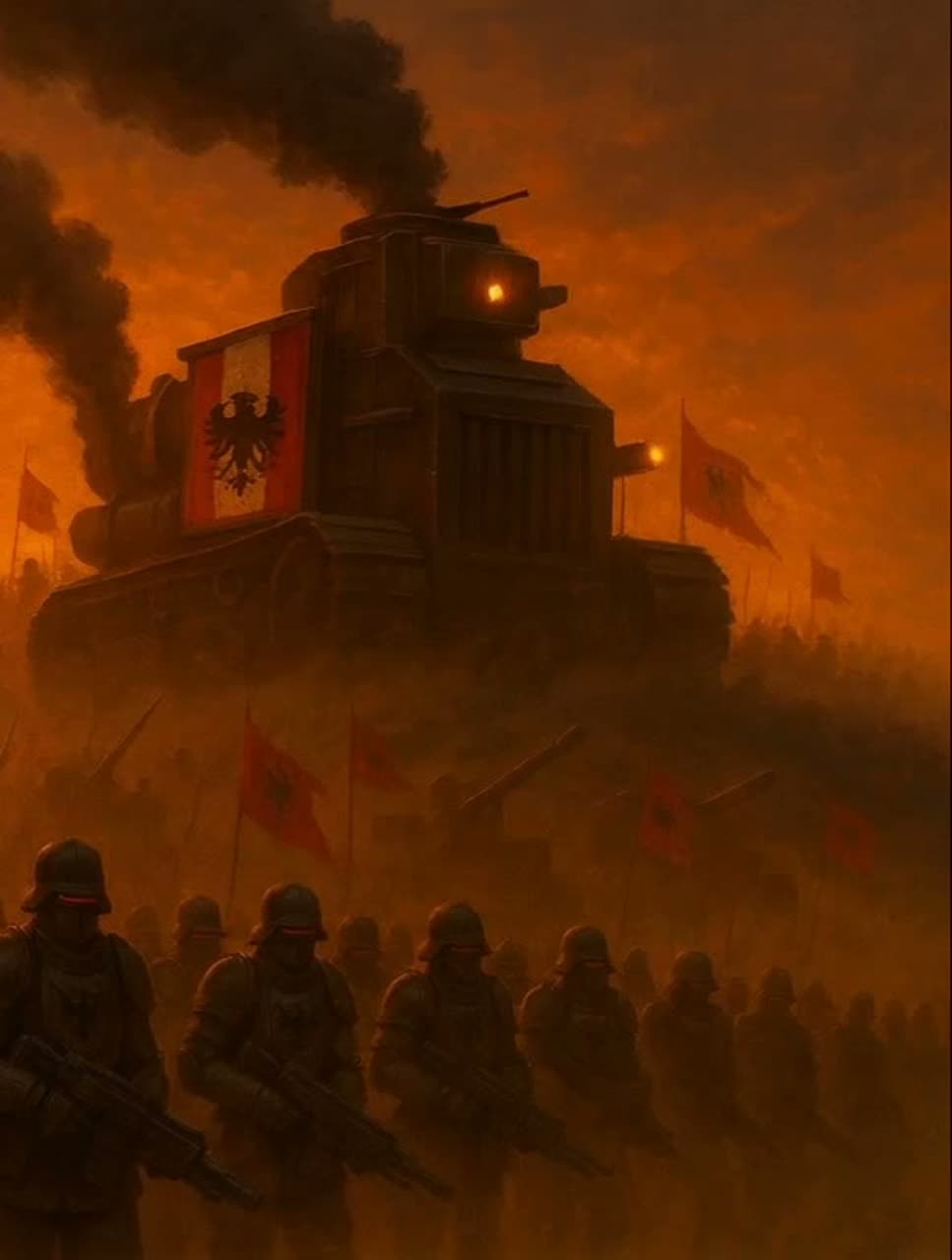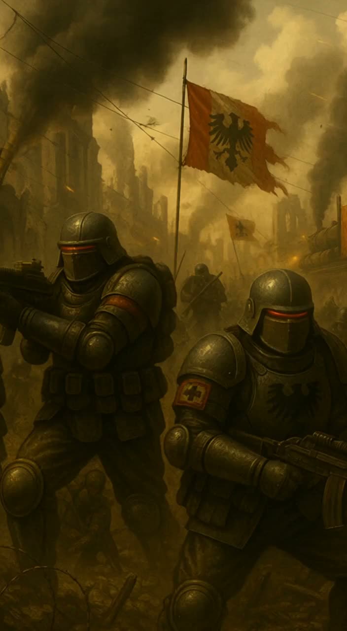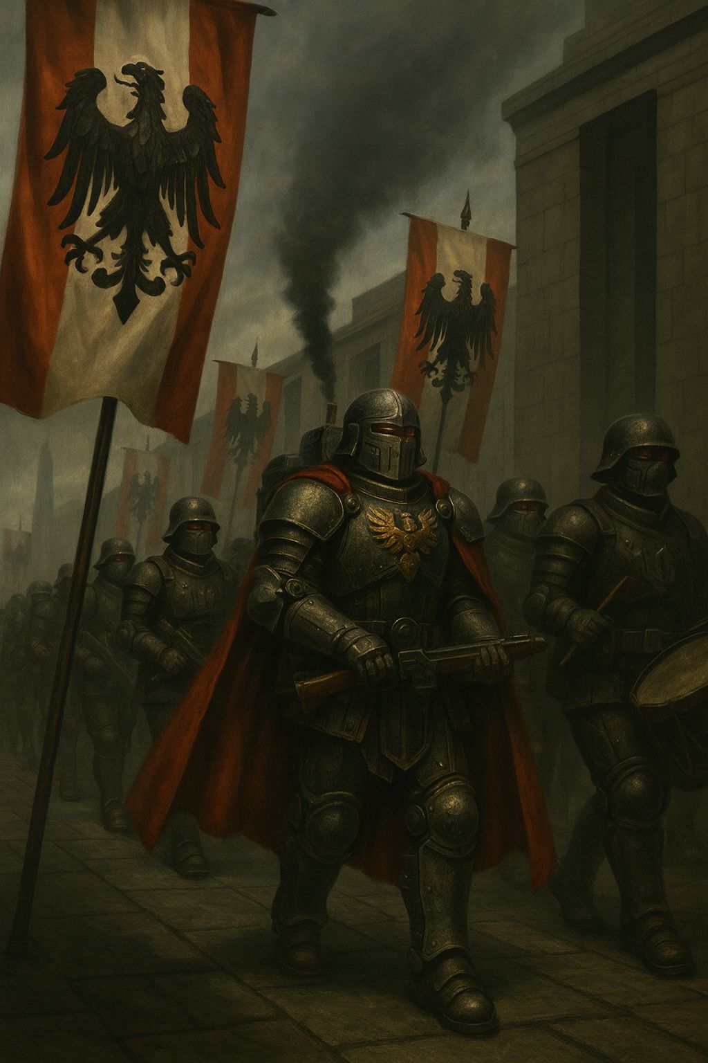 > Processional, dark martial dirge in 4/4, 80–88 BPM, E minor, Structure: Intro (drum cadence + distant bell) → Verse (low-brass ostinato, strings staccato underlay) → Bridge (choir crescendo) → Finale (tutti hits, long decay), Instrumentation: bass drum, field snare (rudimental rolls), cymbals, trombones/tuba doing dotted rhythms, horns for call-and-response fanfares, strings mostly sustained, timpani swells, subtle church organ pedal, Choir = group chant only, unison or simple thirds; no solo lines, no narrative lyrics, Mix: narrow stereo, room reverb, slight tape saturation; avoid modern synths or guitars