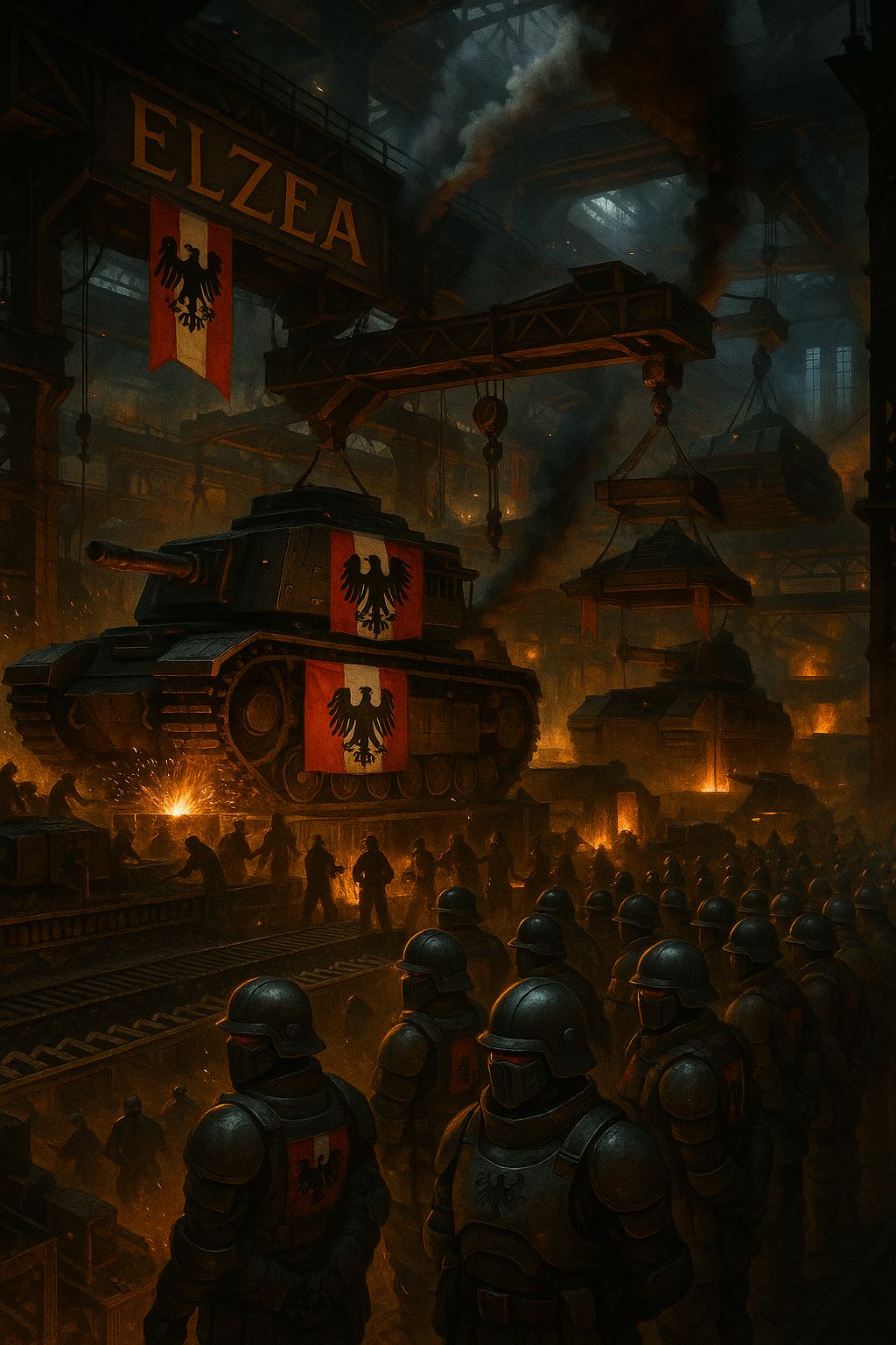 > Processional, dark martial dirge in 4/4, 70–78 BPM, E minor, Structure: Intro (drum cadence + distant bell) → Verse (low-brass ostinato, strings staccato underlay) → Bridge (choir crescendo) → Finale (tutti hits, long decay), Instrumentation: bass drum, field snare (rudimental rolls), cymbals, trombones/tuba doing dotted rhythms, horns for call-and-response fanfares, strings mostly sustained, timpani swells, subtle church organ pedal, Choir = group chant only, unison or simple thirds; no solo lines, no narrative lyrics, Mix: narrow stereo, room reverb, slight tape saturation; avoid modern synths or guitars