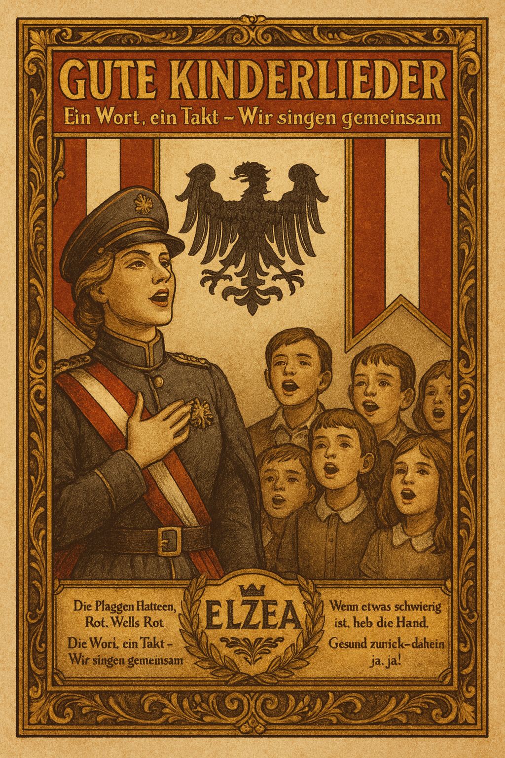 NO SOLO LEAD, CHILDREN’S CHOIR ONLY (unison), School-band march, 2/4 at 108–114 BPM, major key, 1940s educational radio tone; instrumentation: reed organ/harmonium, clarinet, piccolo, muted brass, snare + bass drum, triangle, glockenspiel, Simple 8-bar verse + 8-bar refrain structure; catchy “call words” but keep choir unison, no solo lines, Mix: mono AM radio, bandwidth 250 Hz–5 kHz, tube/valve warmth, vinyl/shellac crackle, subtle hum, short room reverb, Avoid modern FX and wide stereo