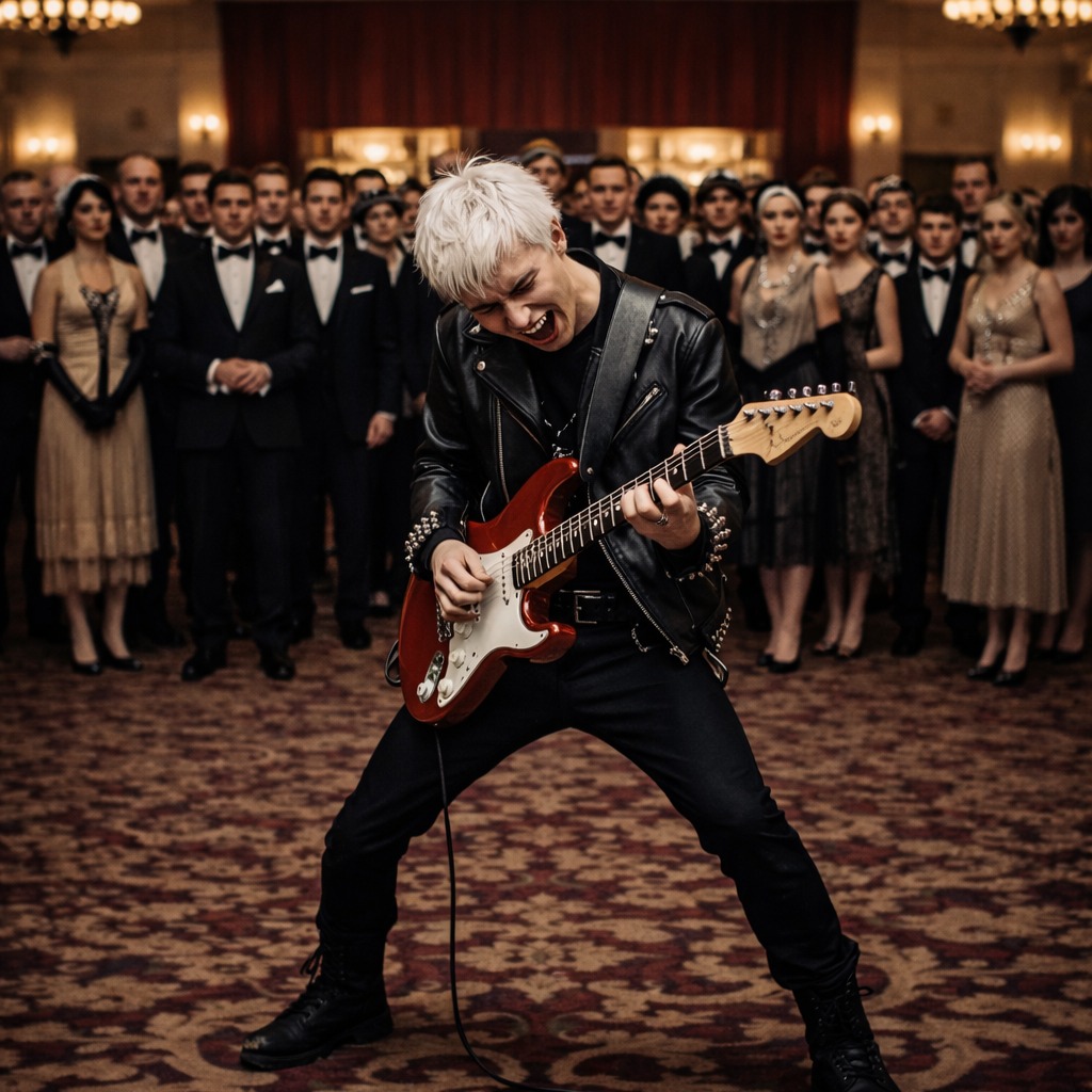 energetic J-Rock with punk and blues essence, fast tempo (BPM160), band sound, male aged voice