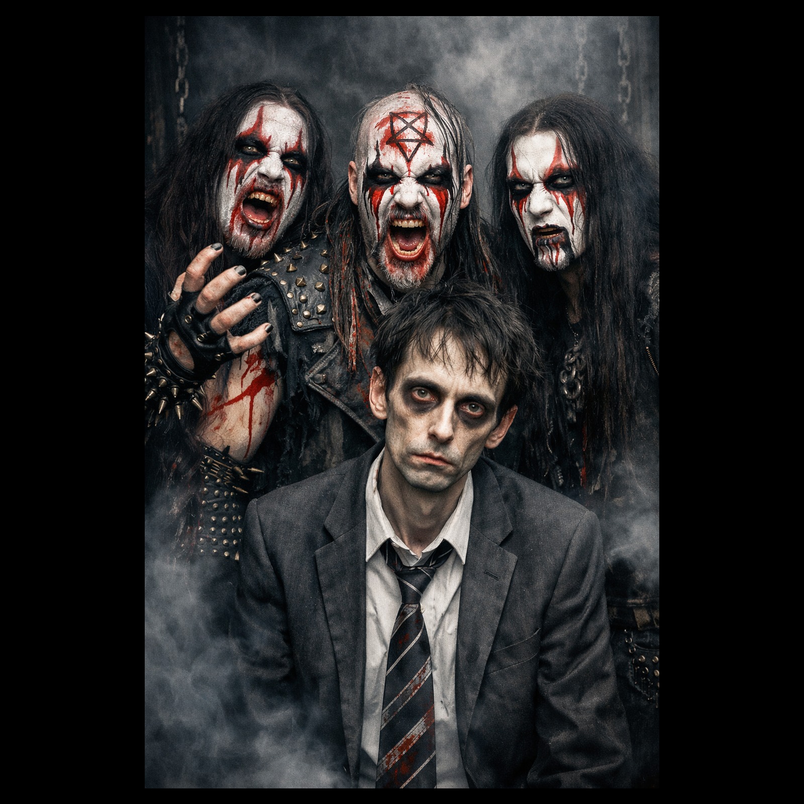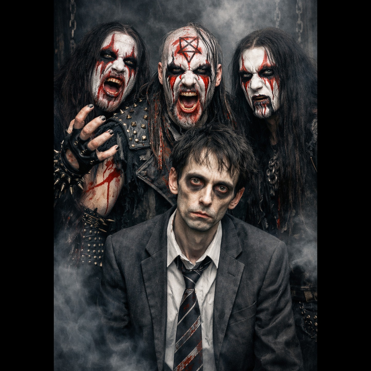 comical dark synth-metal fusion, BPM142, male singer, beach horror vibe, techno groove, death growl