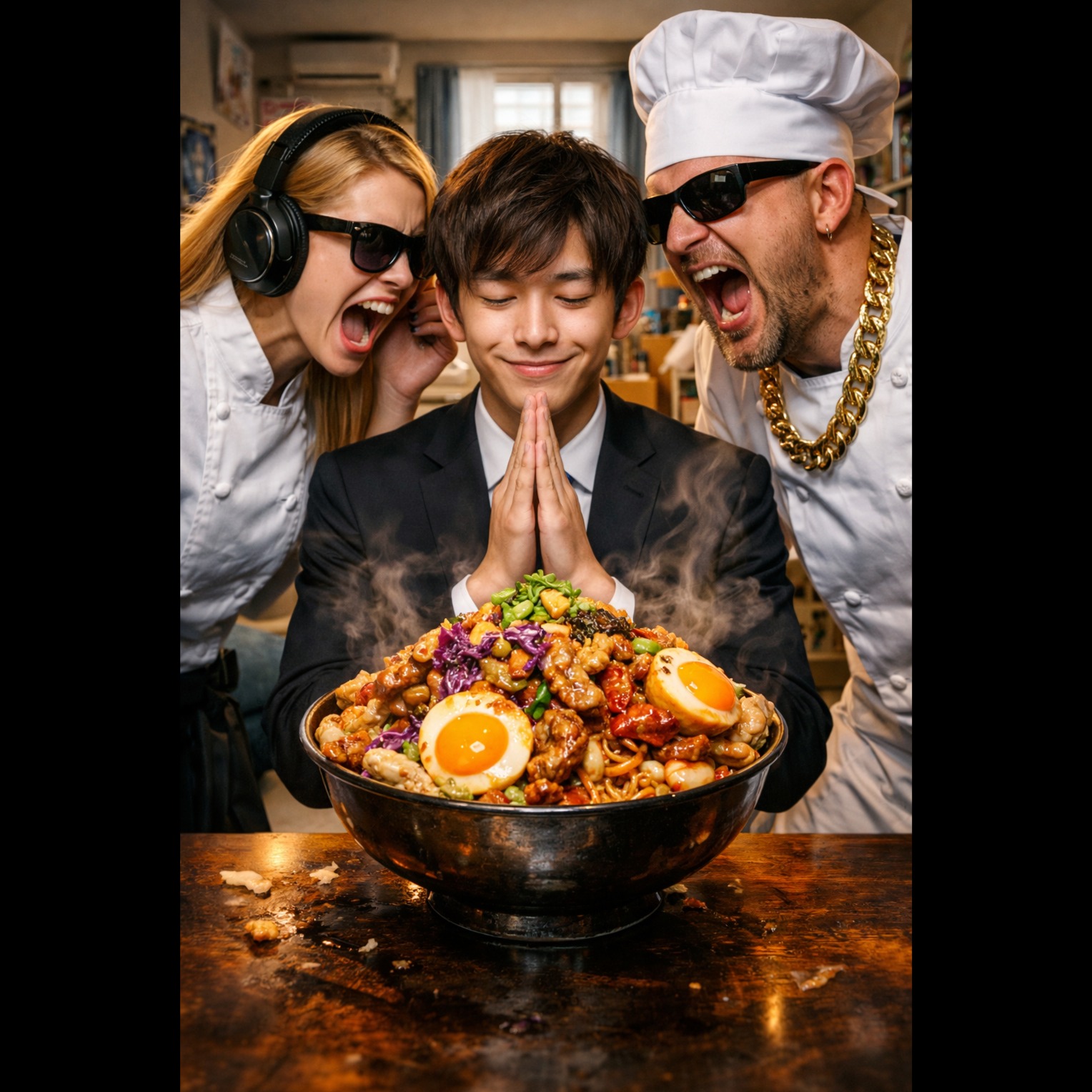 Russian hardbass, techno dance, rap rock fusion, aggressive male vocal with comedic master tone, fast BPM 120, heavy bass, distorted synth, rhythmic Japanese lyrics with strong internal rhymes, short catchy sentence chorus, female high-pitched backing vocals in chorus (call and response), energetic, playful, humorous