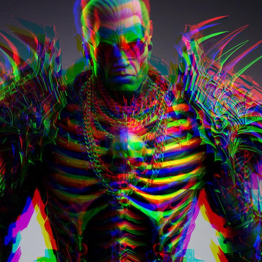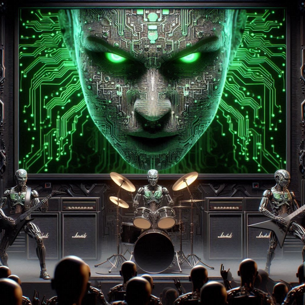 Glitchy, synthwave metal, retro synths, driving beats, cinematic atmosphere, Distorted AI Vocals