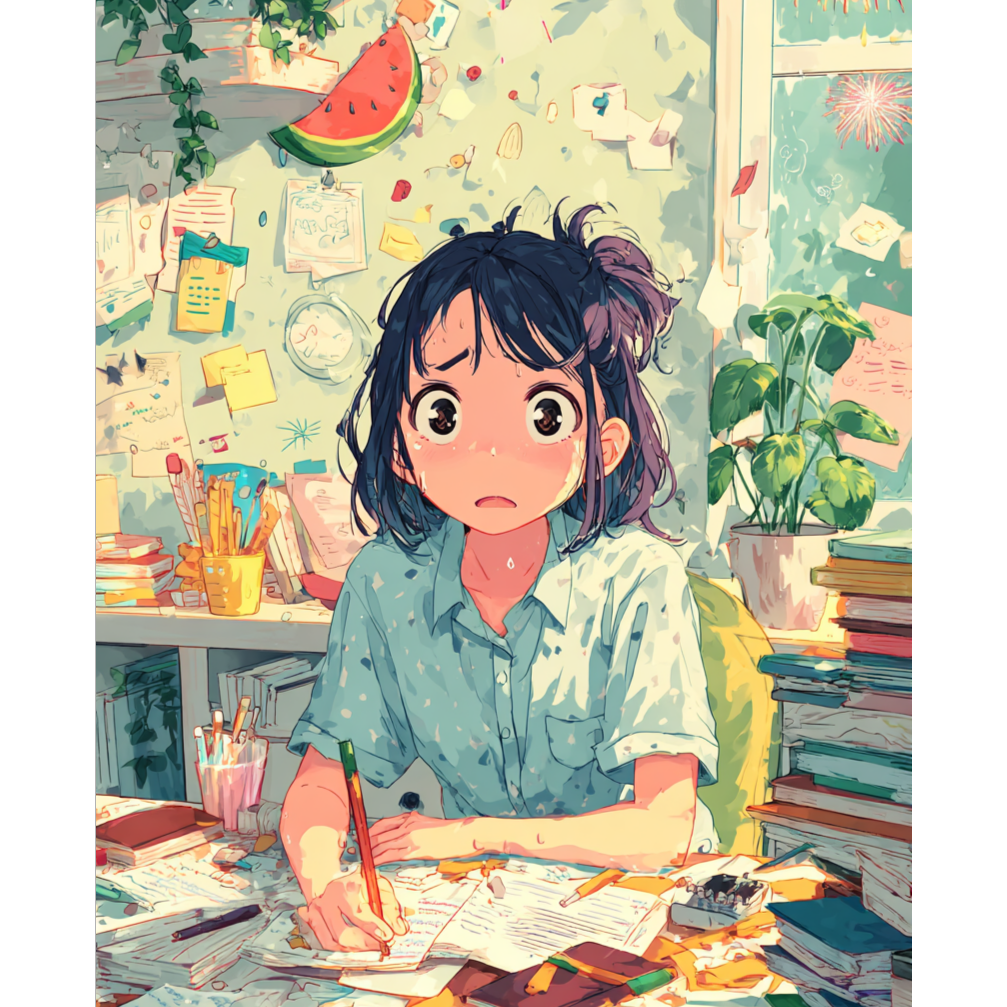 J-Core, Kawaii Speedcore, Denpa Song, BPM 190, high-energy, fast-paced, driving beat, rapid distorted kickdrums, double-time hi-hats, bright yet slightly comedic chord progressions, female vocal, playful and chaotic summer festival sound effects, energetic arrangement with sudden mood swings, catchy and addictive chorus, humorous and self-deprecating lyrics about regretting not doing summer homework earlier, full length 3-minute song, extended arrangement, intro, verse 1, chorus, verse 2, chorus, bridge, final chorus, outro, exclude styles: lo-fi, ambient, chill, orchestral soundtrack, cinematic score, ballad, R&B, trap, lo-fi hip hop, synthwave, vaporwave, downtempo, pop rock, acoustic, folk, reggae, dub, bossa nova, country, jazz ballad, ‑exclude styles: lo-fi, ‑ambient, ‑chill, ‑orchestral soundtrack, ‑cinematic score, ‑ballad, ‑R&B, ‑trap, ‑lo-fi hip hop, ‑synthwave, ‑vaporwave, ‑downtempo, ‑pop rock, ‑acoustic, ‑folk, ‑reggae, ‑dub, ‑bossa nova, ‑country, ‑jazz ballad