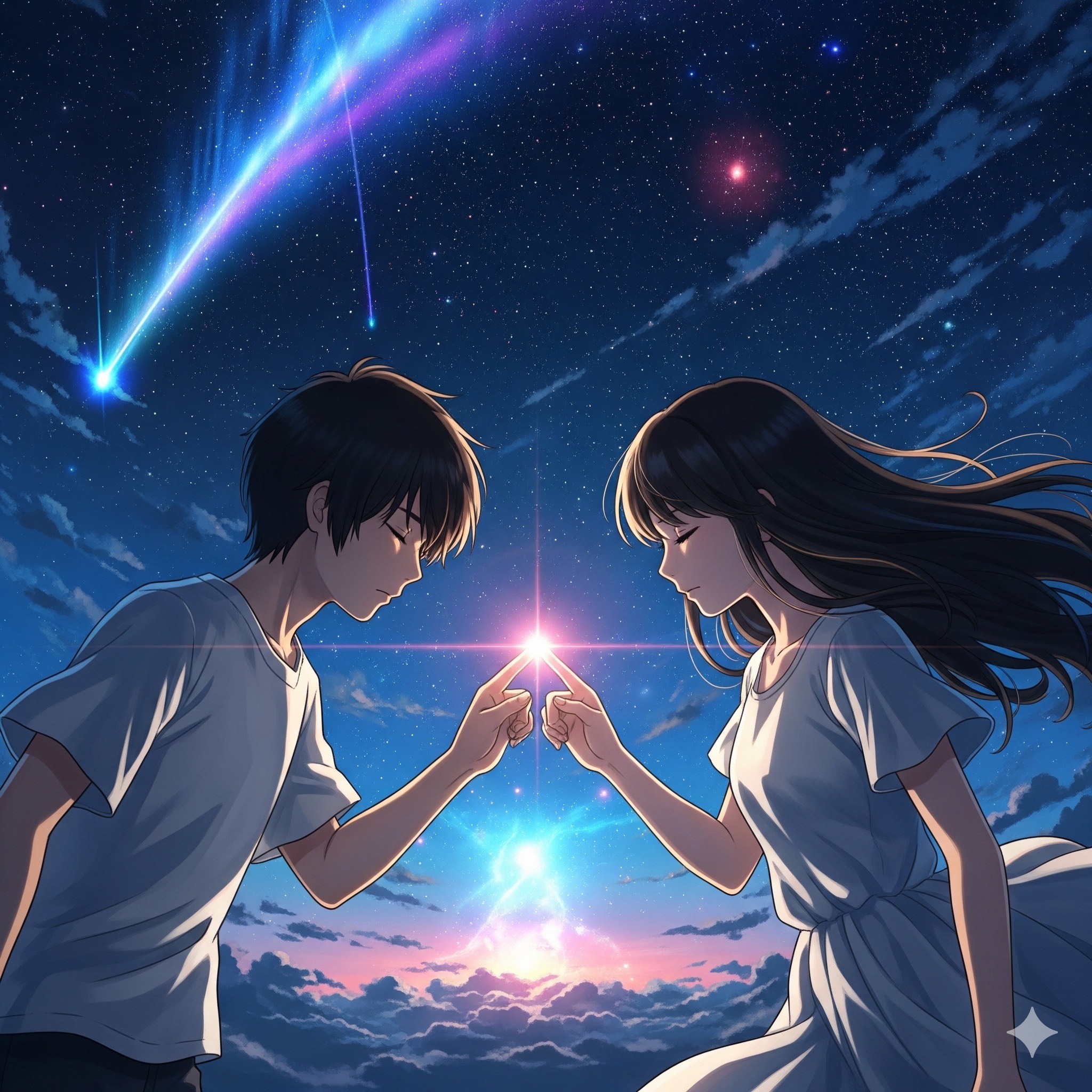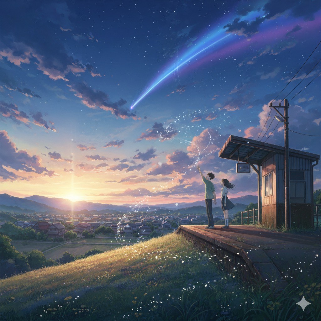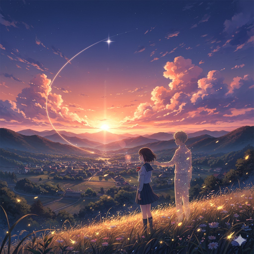 A nostalgic Japanese cinematic ballad blending gentle acoustic guitar, soft piano, and warm strings, The melody should evoke the bittersweet feeling of summer memories and lost love under a starry sky, The vocals are emotional yet restrained, expressing longing and quiet hope, The overall atmosphere is reflective, airy, and slightly melancholic — reminiscent of youth, memory, and the passage of time