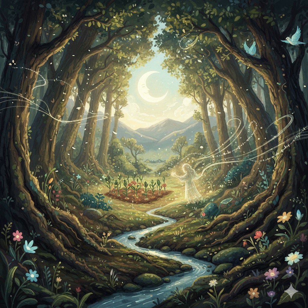 “Ethereal Indie Folk” – Gentle acoustic guitar, layered with soft atmospheric pads, subtle percussion, and airy female vocals, The mood should feel mystical, intimate, and slightly melancholic, evoking the image of a lone traveler under the moonlight casting a spell
