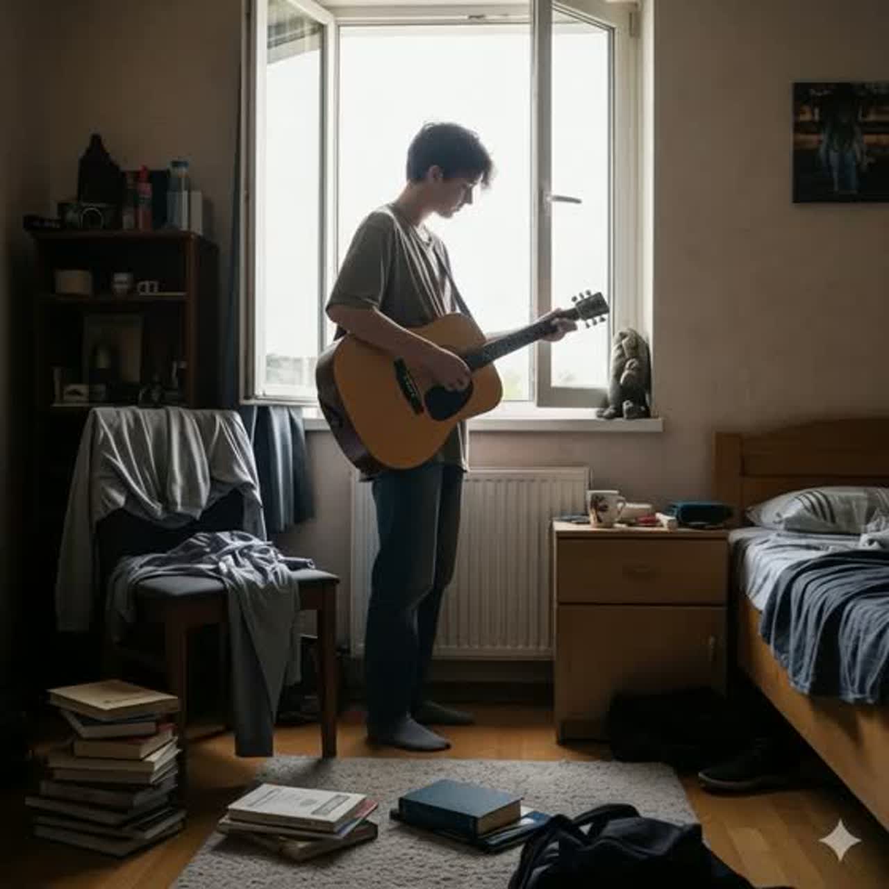 Indie Pop / Acoustic Rock” – Stripped-down arrangement with jangly acoustic guitar or light electric guitar riffs, a steady drum groove, and straightforward bass line, The vocal delivery should be casual and slightly raw, almost like speaking in rhythm, with lyrics front and center, The overall mood balances a bit of melancholy with playfulness, giving it that bittersweet, everyday