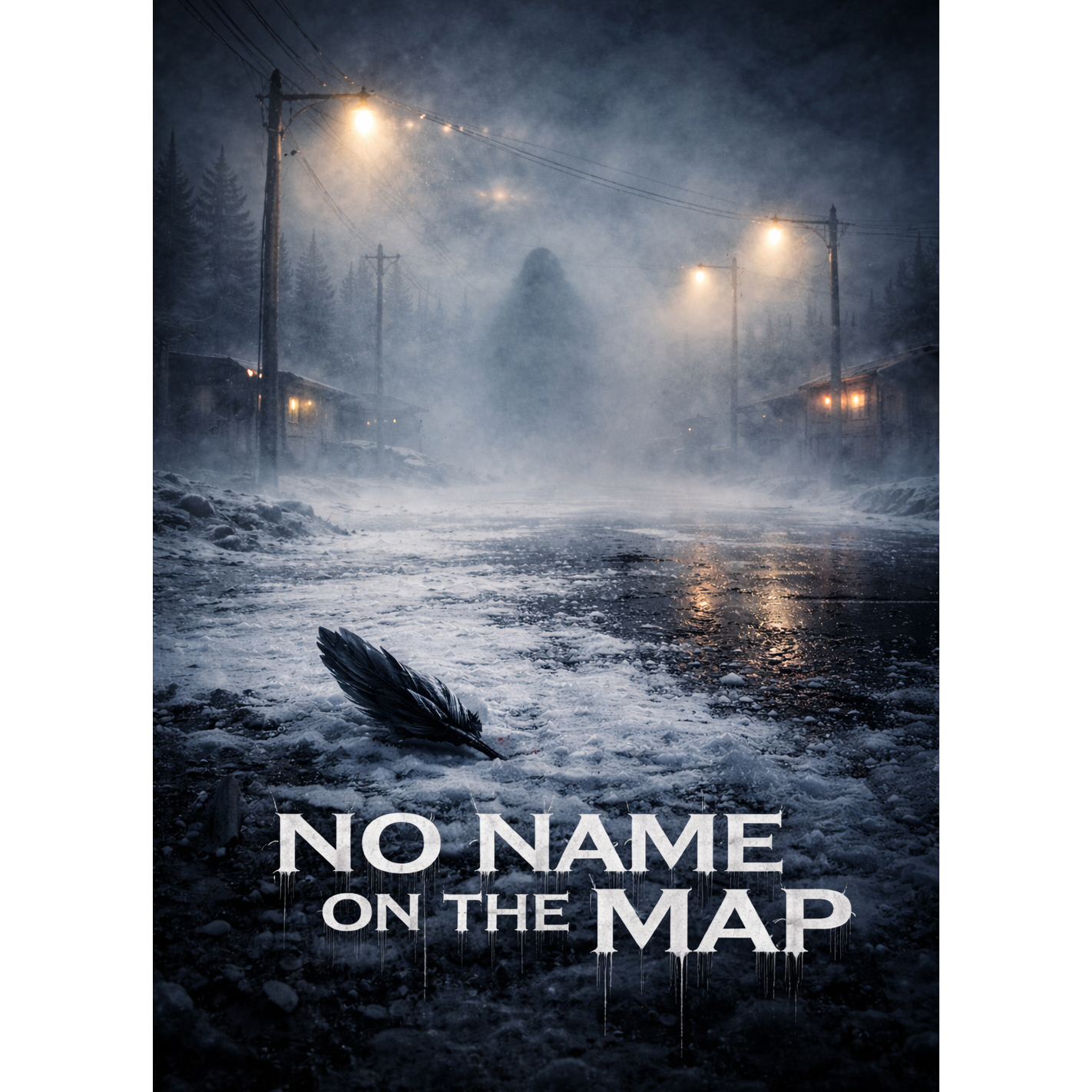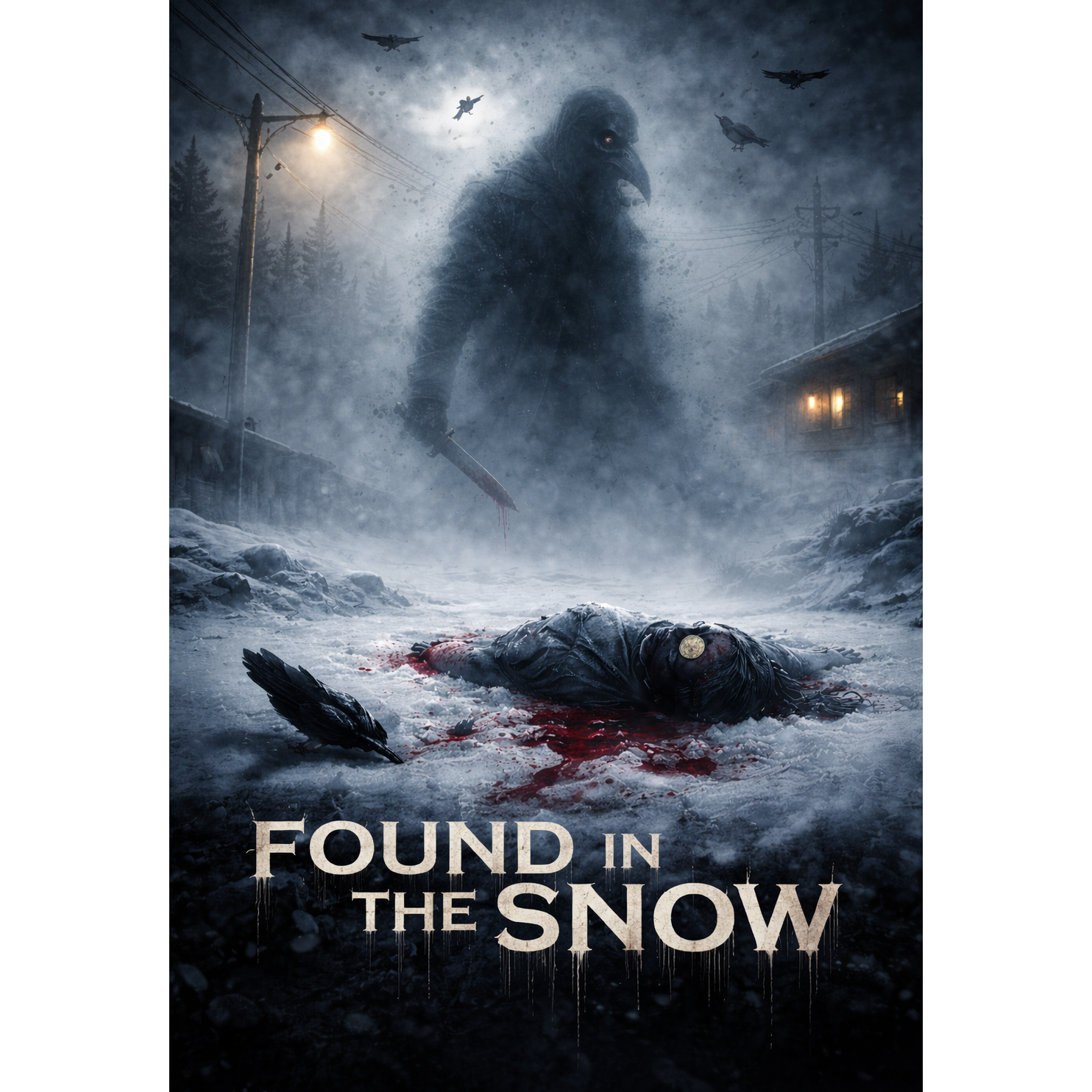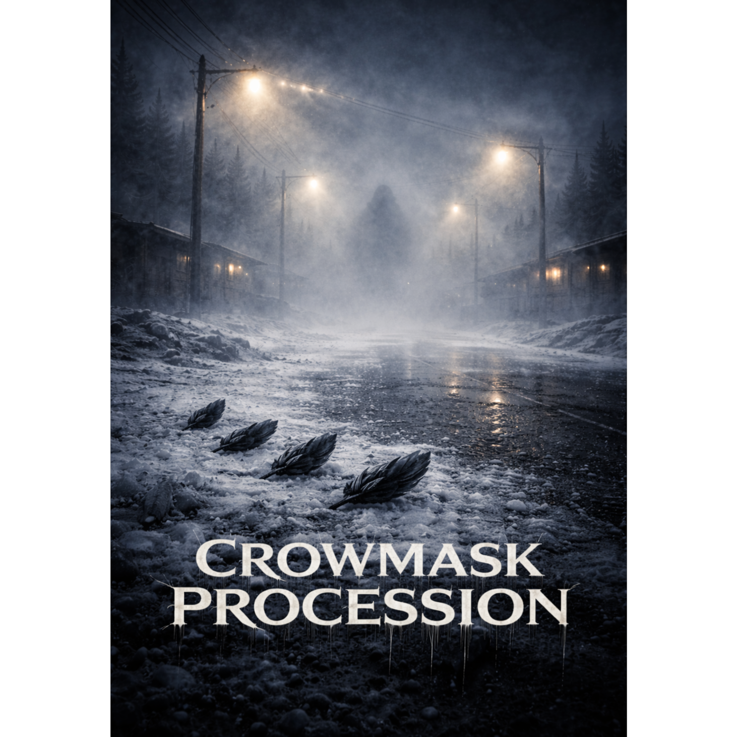 Cinematic deathcore, 92–160 BPM dynamic tempo shifts, massive downtuned 8-string guitars, tight palm-muted chugs, bleak tremolo accents, sub drops, orchestral low strings and brass stabs (no choirs), eerie synth drones, cold reverb tails, foley ambience (winter wind, distant sirens, crows), punchy modern mix, breakdowns with cinematic hits, no clean vocals, only harsh vocals (guttural growls + high screams), story-driven, dark noir atmosphere, 3:30–4:50 runtime