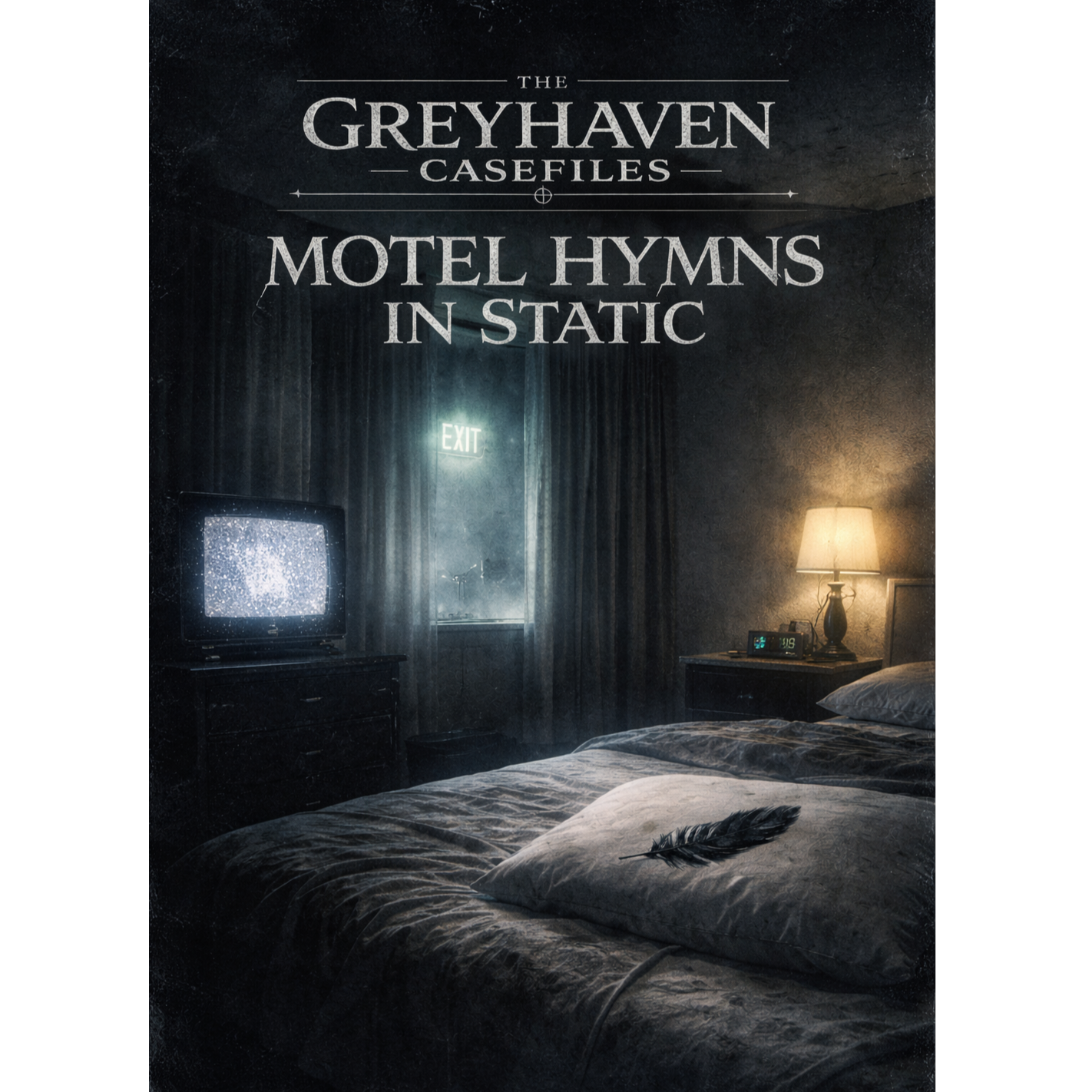Cinematic deathcore noir, 105–175 BPM tempo shifts, massive downtuned 8-string guitars, tight punchy mix, orchestral low strings + brass hits (no choir), eerie synth drones, TV static texture, motel room tone, distant sirens muffled by unnatural fog, sub drops, crushing breakdowns, only harsh vocals (guttural lows + high screams), 4:40 runtime