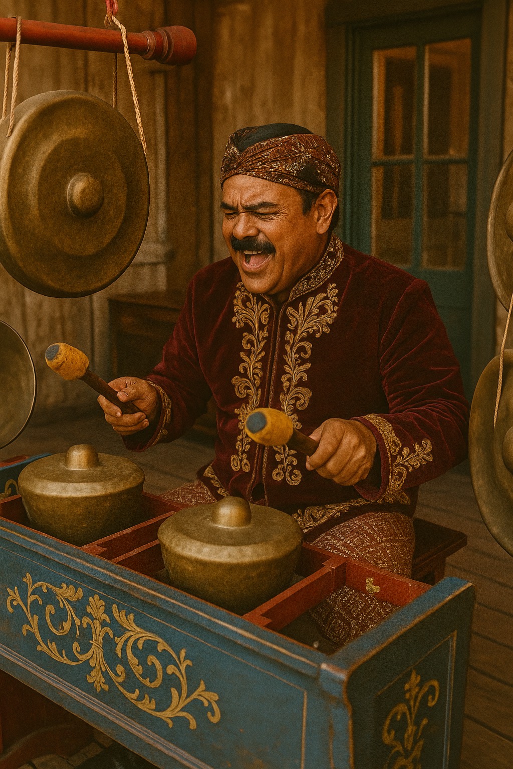 gamelan balinese, gamelan javanese, fusion, 108 bpm, 4 4, pelog and slendro, metallophones saron bonang gender gangsa, reyong patterns, kenong kempul gong ageng, kendang hand drums, ceng ceng cymbals, interlocking kotekan, colotomic cycles, temple hall reverb, wooden mallets, honky tonk piano accents low, felt upright, lead vocal soft airy, close mic, light harmonies, natural dynamic master, ‑balkan punk, ‑gypsy punk, ‑punk rock, ‑d beat, ‑distorted downstroke guitar, ‑overdriven pick bass, ‑shout gang vocals