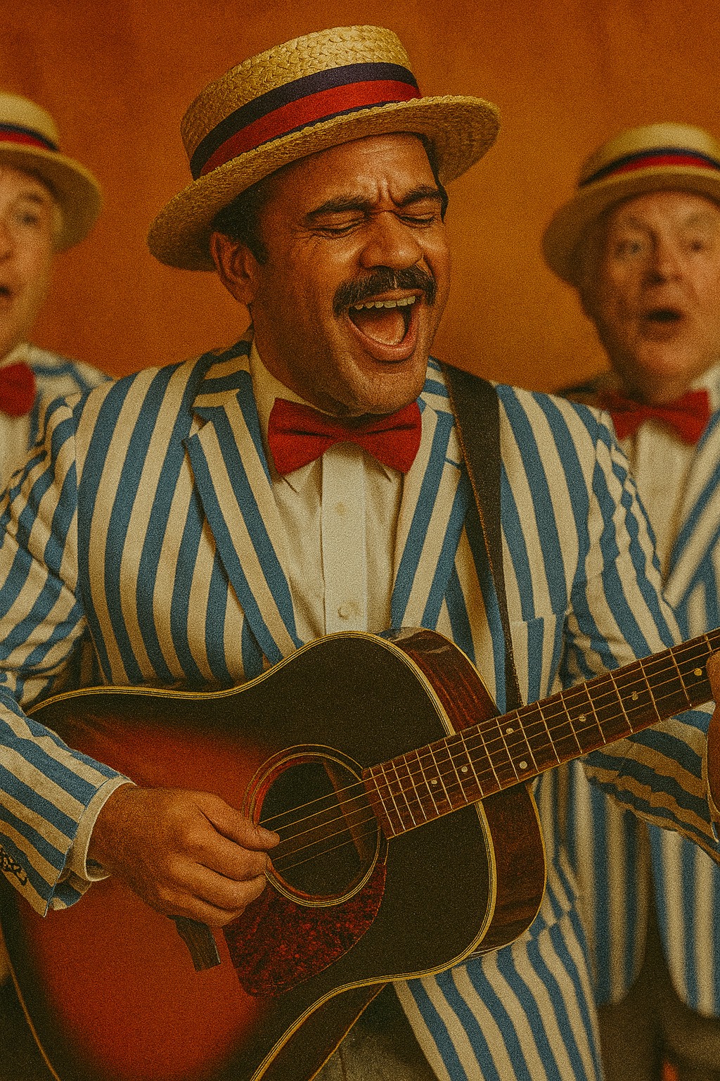 Barbershop quartet, a cappella close harmony, TTBB, just intonation, ringing chords, dominant seventh focus, bell chords, swipes, tags, posts, lead with tenor sparkle, bass pedal tones, baritone glue lines, light rubato at tags, brisk 4 4, 116 bpm, clean rehearsal room reverb, no instruments, natural blend, tight cutoffs