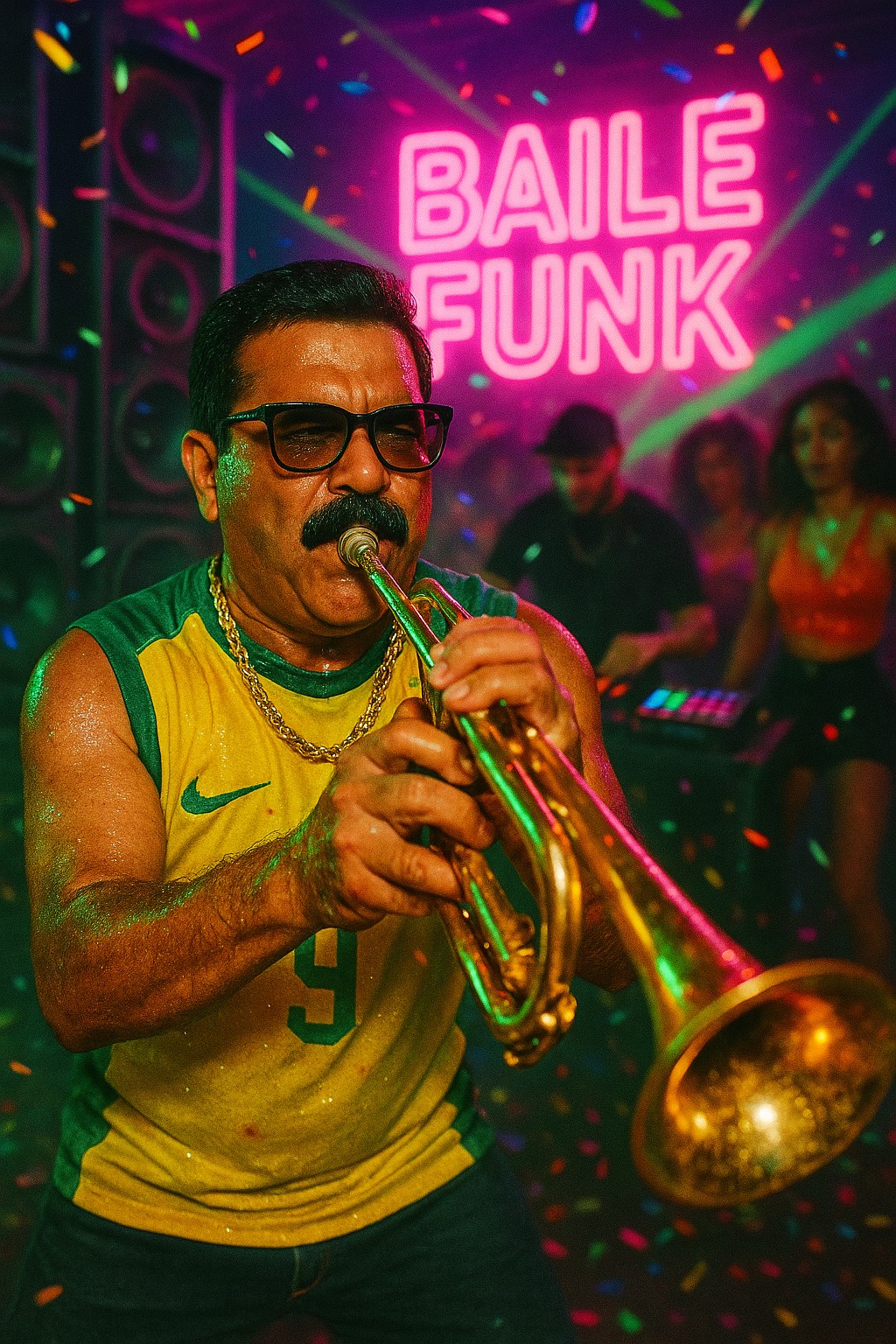 baile funk, funk carioca, 135 bpm, 4 4, over the top tamborzão, sub heavy kick, clipped snare, distorted 808 toms, agogo, tamborim, cuica squeak, apito whistle barrage, dj shoutouts, air horn stabs, siren fx, reverse snare, fake rewind, stop time drops, brass stabs trumpet trombone sax, short horn riffs, chopped vocal shots, call and response hooks, saturated percussion, bright top end, heavy sidechain, limiter slam, street party energy