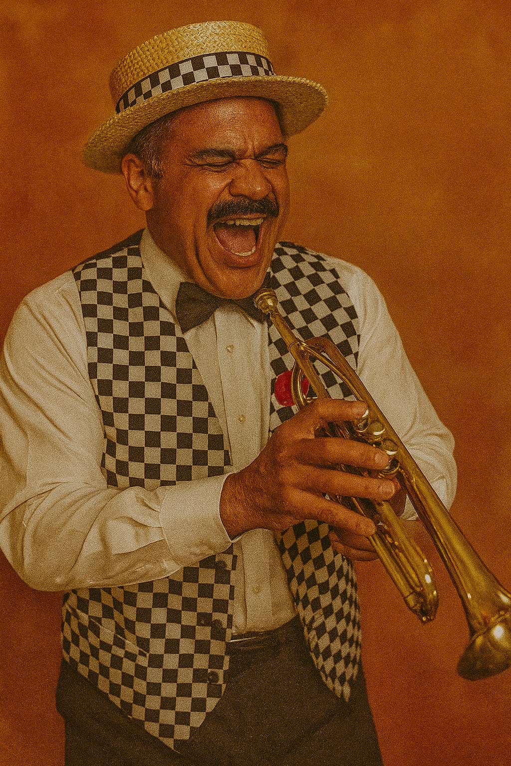 Ska, two tone, 148 bpm, offbeat upstroke guitar, walking bass, tight rimshot snare, bright horn section trumpet trombone sax, percussive organ bubble, gang shouts, sunny tempo, crisp room reverb, energetic clean mix, final chorus key lift, live band feel