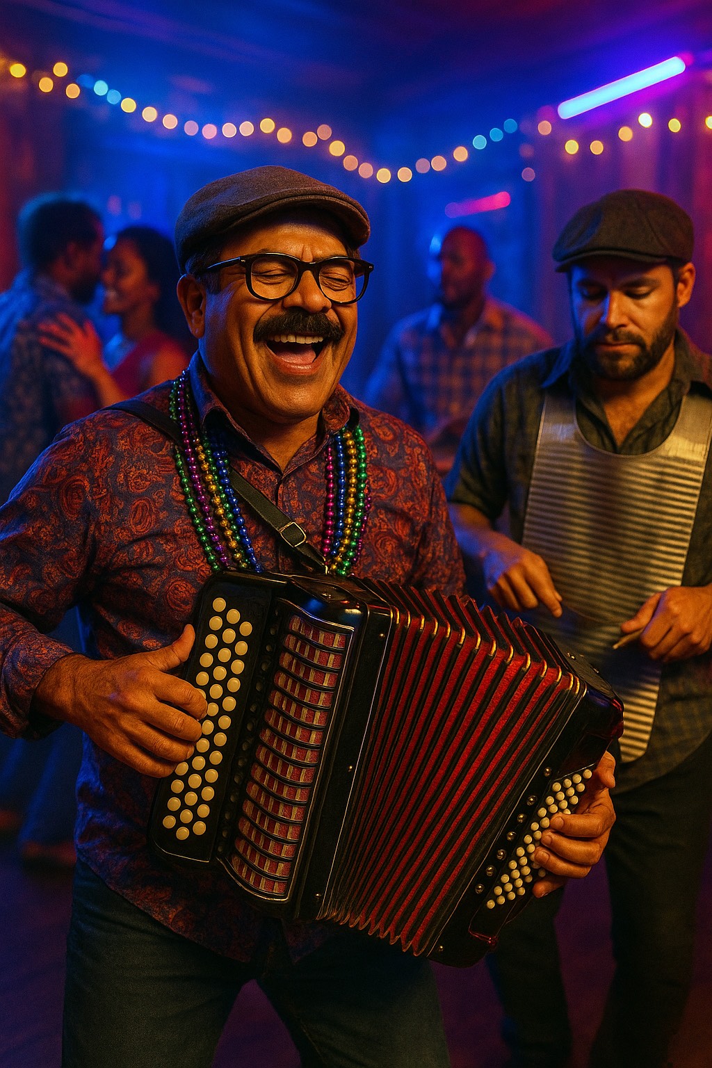 zydeco, cajun creole dance, 150 bpm, 4 4 two step, accordion lead, frottoir rubboard, electric guitar chank, upright or electric bass two beat, snare backbeat rimshot, kick on 1 and 3, triangle ticks, light fiddle optional, handclaps, call and response shouts, bright room reverb, lively party vibe, clean punchy mix, key lift final chorus, ‑trap, ‑hip hop, ‑drill, ‑edm, ‑dubstep, ‑house, ‑techno, ‑trance, ‑drum and bass, ‑metal, ‑rock, ‑punk, ‑ska, ‑reggae, ‑reggaeton, ‑amapiano, ‑afrobeat, ‑salsa, ‑bossa nova, ‑cumbia, ‑merengue, ‑klezmer, ‑barbershop, ‑opera, ‑orchestral, ‑hyperpop, ‑shoegaze, ‑lofi, ‑polka