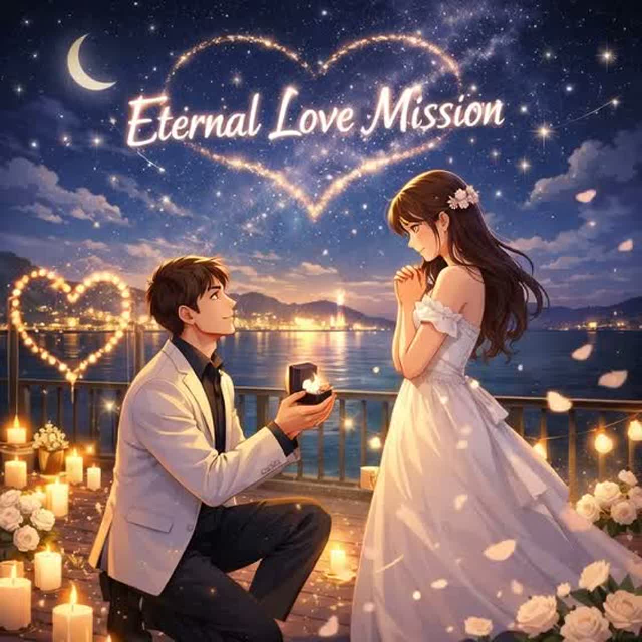 An emotional, addictive, and uplifting love anthem titled “Eternal Love Mission, ” built around a bright yet powerful romantic atmosphere with a tempo around 132 BPM, blending modern J-POP, emotional EDM, and cinematic love ballad energy, opening with soft ambient pads, distant piano echoes, and a gentle heartbeat pulse that symbolizes two souls connecting, gradually introducing shimmering synth arpeggios, warm bass, and crisp rhythmic claps, leading into a heartfelt male vocal delivering sincere, tender, and determined emotions like a confession of eternal love, followed by a soft yet luminous female vocal answering with warmth and destiny, forming a powerful duet dynamic, the pre-chorus builds tension with rising chords, emotional harmonies, and filtered beats, creating anticipation and emotional lift, then exploding into a huge, euphoric chorus driven by bright synth leads, punchy kick, layered claps, emotional piano, and wide cinematic strings, the hook phrase “Eternal Love Mission”