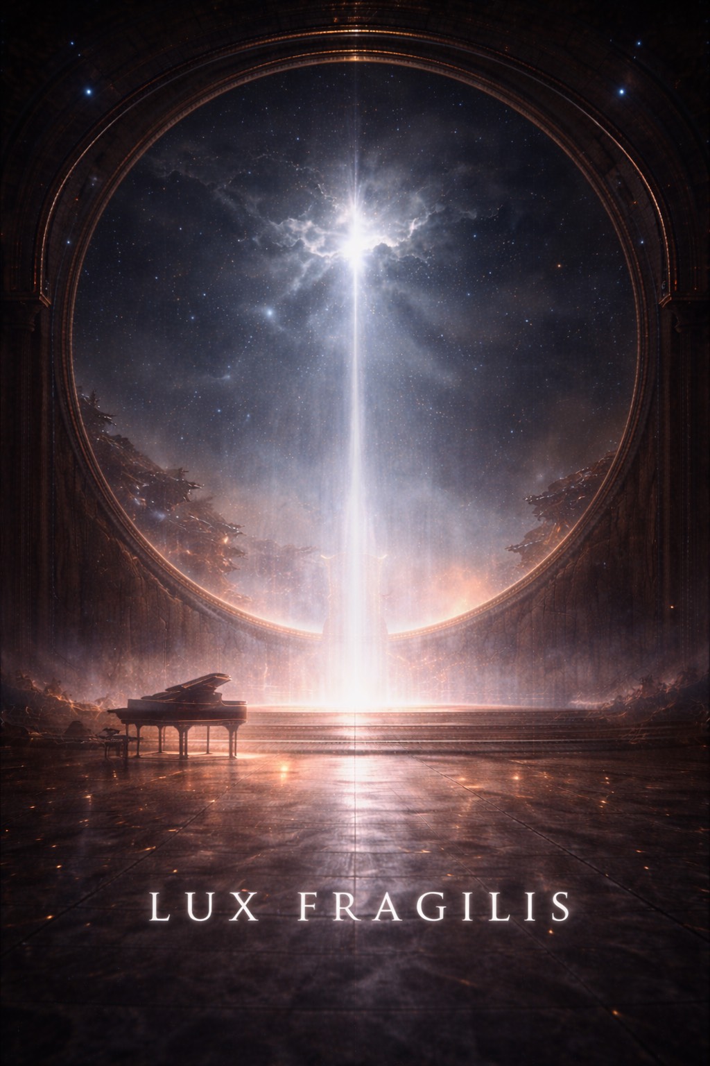 Cinematic orchestral piece 4 to 5 minutes in length, Piano-forward in a minor key, delicate and intimate, as if the light is present but fragile, Soft ambient synth pads shimmer underneath, weightless and restrained, Strings enter gradually—first thin and trembling, then swelling into a hopeful but cautious rise, No dance beats, minimal percussion focusing on emotional tension and vulnerability, Feels like holding a single flame in open air: beautiful, breakable, and sacred, Ends unresolved, leading naturally into a spoken interlude, Instrumental