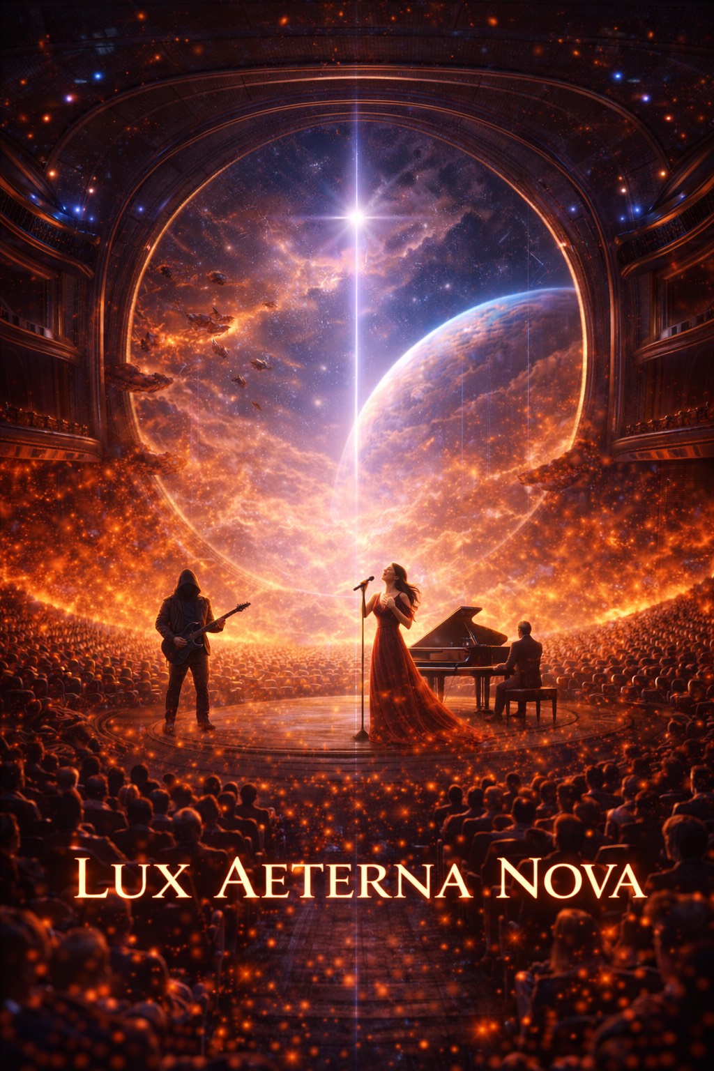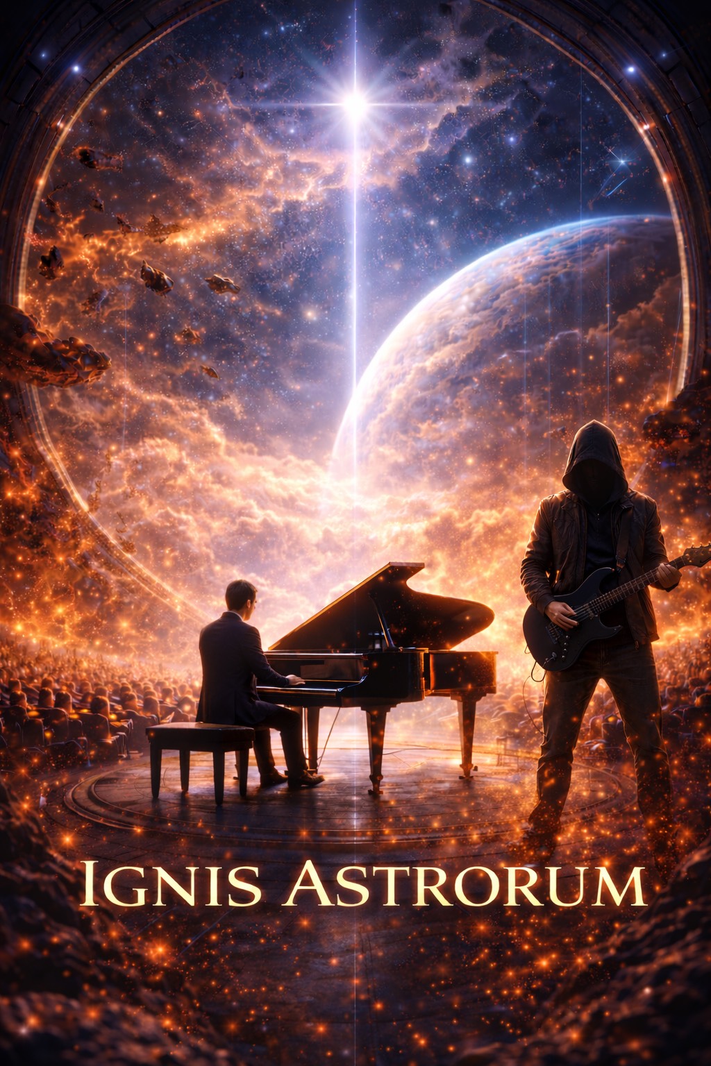 Epic long-form (5 minutes plus) orchestral techno opus Begins slowly with solitary grand piano in a minor key, spacious and reverent, Gradually introduces ambient synth textures and distant strings, Epic strings swell over time, joined by full cinematic percussion and deep orchestral drums, Electric guitar enters with sustained, emotional lines—not aggressive, but powerful and soaring, The track builds steadily into a massive cinematic climax with layered orchestra, driving percussion, and electrified intensity, Emotional, triumphant, and awe-inspiring, Feels like starlight igniting into fire, Instrumental, Slow piano intro → atmospheric rise → string expansion → percussion enters → electric guitar lift → full orchestral climax → resolved cinematic ending