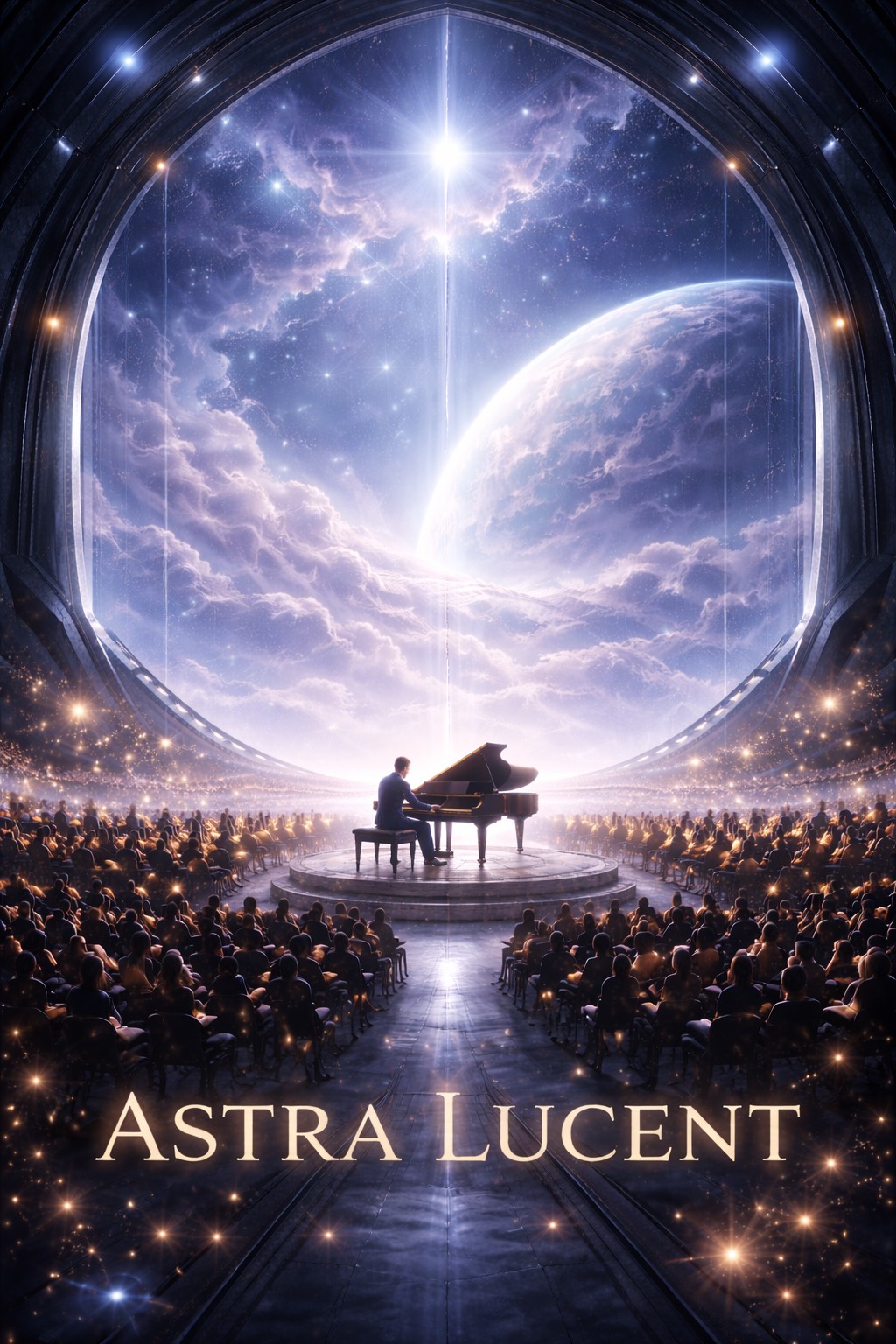 Piano-forward futuristic orchestral piece with ambient synth fusion, Bright, expressive piano leads the melody, supported by soaring strings and gentle brass, Soft ambient synth pads shimmer underneath, adding a modern celestial atmosphere, More upbeat and hopeful than mournful, but restrained and elegant—no dance beats, no percussion-driven rhythm, Music feels like ascending through the stars at dawn, luminous, emotional, and cinematic, Instrumental
