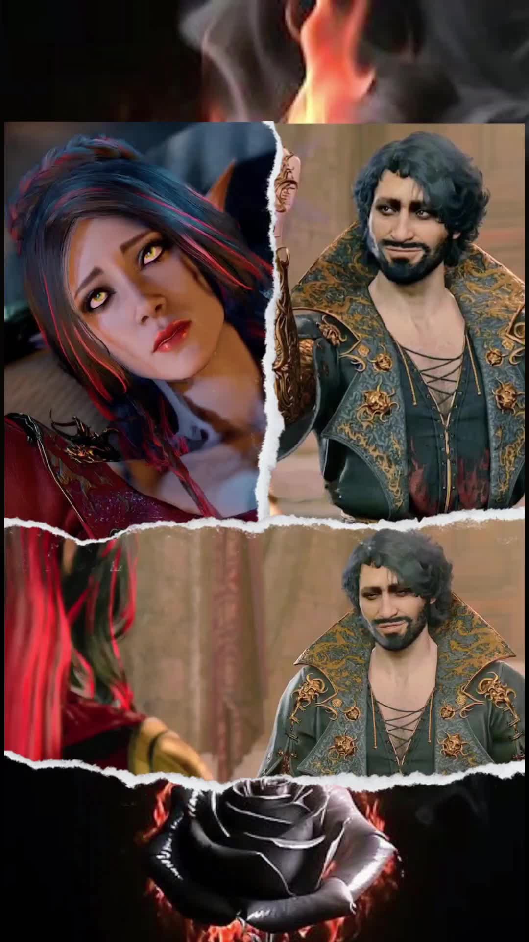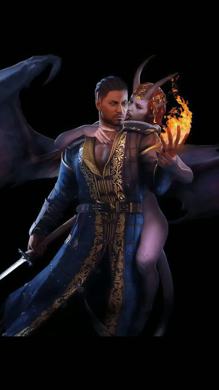 Beautiful clear deep male Voice, clear raw powerful female voice, emotional, Dark Rock, Gothic Metal, Slow, reverb-drenched guitars, dramatic guitar swells, power chords, orchestral pads, Heavy breakdown with spoken whispers, deep bass vibrations, Haunting piano, Song about the powerful, lustvoll and deep Love relationship between Karlach And Eredin A dialogue of burnt love, their desire And deep Burning love for each other, male vocals, female vocals