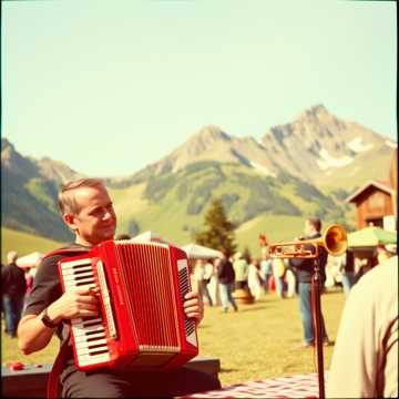 Energetic Oberkrainer folk song in G major, 145 BPM, Close, warm mix, slight reverb, Austrian diatonic accordion drives a lively, swinging rhythm (three sixteenth notes + rest), second accordion brightens with ornamented melodies, Baritone plays tight, dry staccato bass tones with occasional scale runs and classic Oberkrainer flourishes, Trumpet carries the melody with a fresh, clear tone; clarinet responds in spirited call-and-response, Guitar (not Ovation) strums traditional Oberkrainer rhythm with strong, percussive drive, Electric bass doubles the lively polka groove, Light drums (brushes, snare accents, gentle kick) add modern polish without losing natural feel, Electric guitar joins only on a dynamic ending solo, Bavarian singer and baritone voices clear foreground, The arrangement balances tradition and modern flair, blending flawless musicianship, jazz-inspired freedom, and natural festive atmosphere for a bright, danceable Alpine celebration