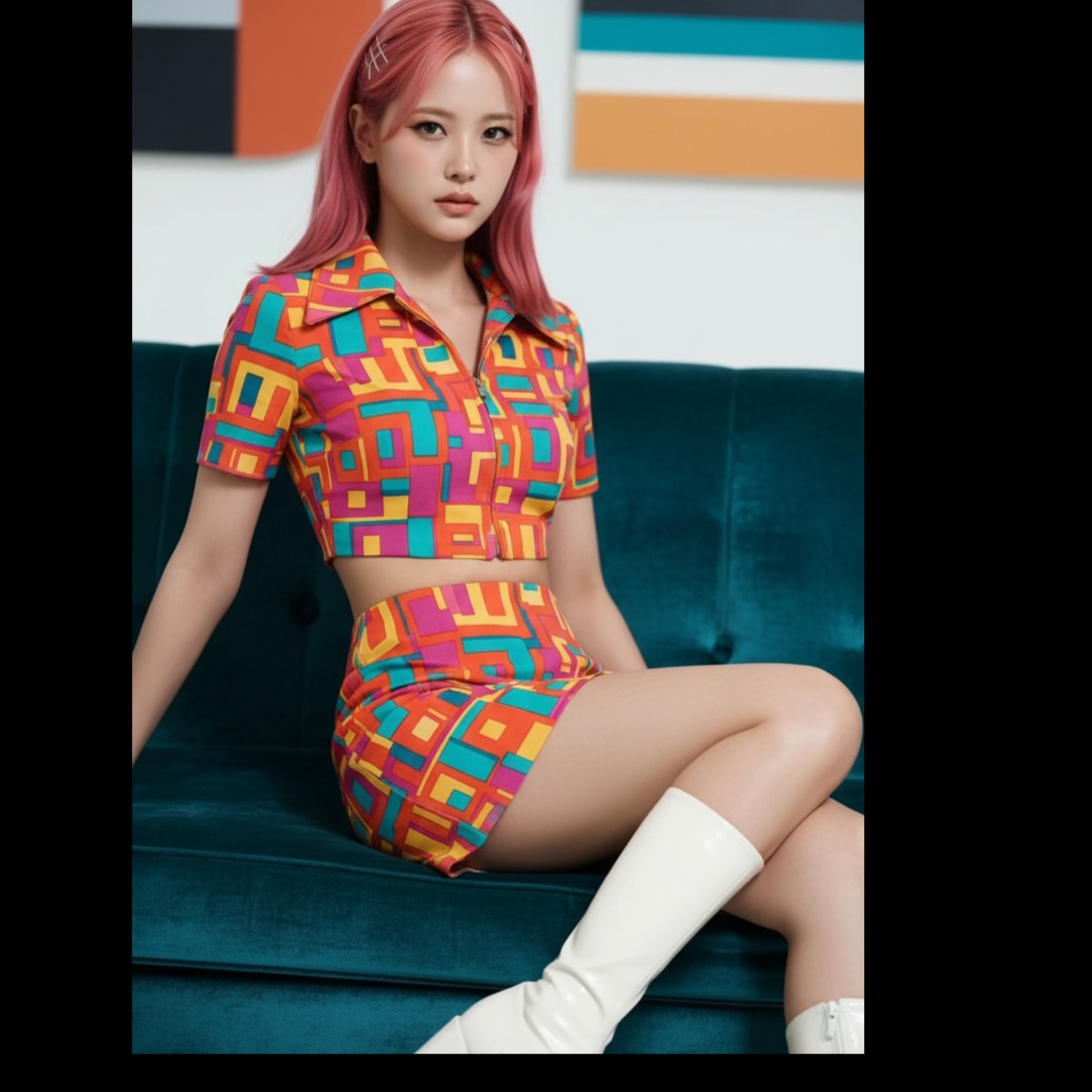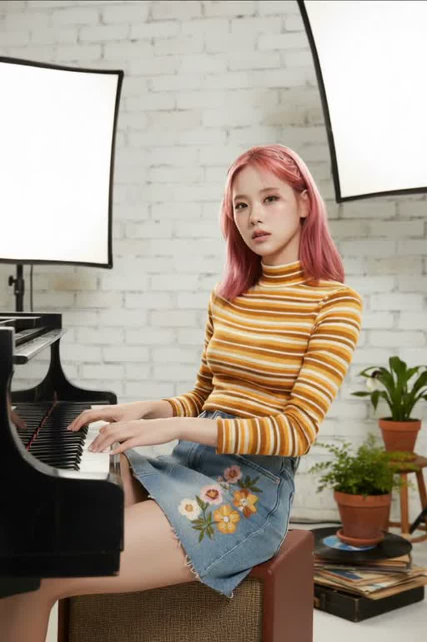 Jenapop piano rock with punk groove, ~140 BPM, key D major, Female vocalist with rich emotional falsetto and warm chest voice, high-pitch centered, extreme close-mic intimacy, Verses use whispery chest tone with intimate storytelling and minimal backing, natural chest-to-falsetto transitions, Chorus features bright soaring falsetto with addictive hook, layered harmonies and strong high-note ad-libs, Bridge delivers emotional high-note climax with extended belting and dynamic ad-lib runs, Instruments: rhythmic piano as main driver playing Canon progression (rock comping + octave hits), aggressive slap bass with percussive attack and deep low-end support, real drum kit (tight kick, punchy snare, energetic punk fills), light electric guitar support for texture only, Interlude led by piano riff + slap bass + drum break, Mixing: punchy low-end, dry intimate vocal in verse, wide stereo expansion in chorus, piano front-mid, bass tight and percussive, fully mastered high-energy polished sound
