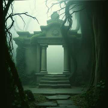 A deeply resonant and chilling piece in A minor, emphasizing low frequency and echoing acoustics, It is primarily built around three male throat singers (performing Kargyraa and Khoomei styles) providing the bass drone, rhythm, and a mournful, cyclical melody, This is backed by low, bowed strings (double bass and cellos) and sparse, breathy brass (muted trombones), The key haunting element is the use of a high, trembling female operatic voice singing non-lexical, wordless lines, representing the spectral energy and the ghost of the Dragon Priest, Morokei, Percussion is provided by deep, slow frame drums and the clatter of loose stone, adding a sense of crumbling ruin and deep cold, The overall effect is ancient, ritualistic, and profoundly unsettling