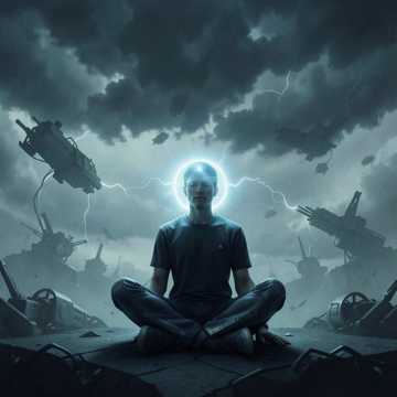 Begin with a soft electric progression, airy and reflective, with subtle harmonic plucks echoing like distant lantern light, Add slow tribal drums with deep toms and a pulsing sub‑bass that vibrates beneath the mix, Industrial textures rise—metallic drones, rhythmic machinery—shifting into a mid‑tempo dark‑metal grind with tight, syncopated riffs, Blend in alt‑metal grit and a controlled nu‑metal bounce, keeping vocals clean, intense, and steady, Two electric guitars break into a soaring dual‑lead section, weaving ascending motifs that collide in a powerful peak, Let the energy dissolve back into a quiet acoustic fade