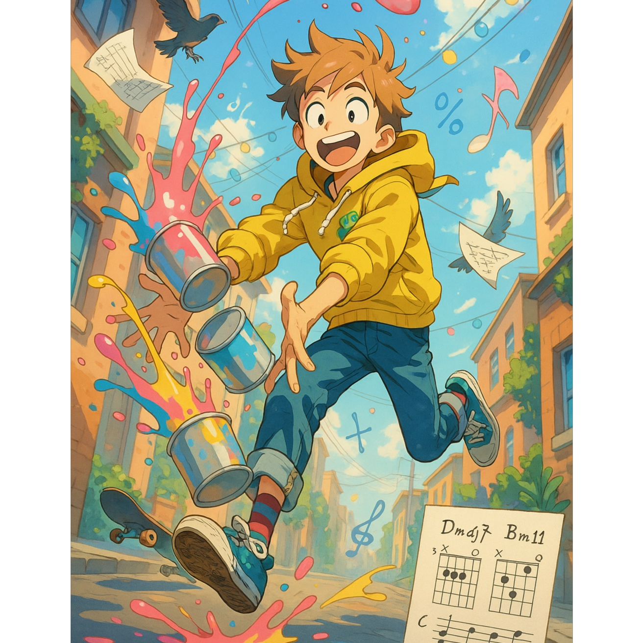 A joyful, high-energy happy song that blends math rock guitar riffs with hyperpop and playful denpa-inspired elements, Clear and bright vocal style with an upbeat tempo, Piano and electric guitar take turns leading catchy melodies, creating a colorful, feel-good atmosphere full of excitement and positivity