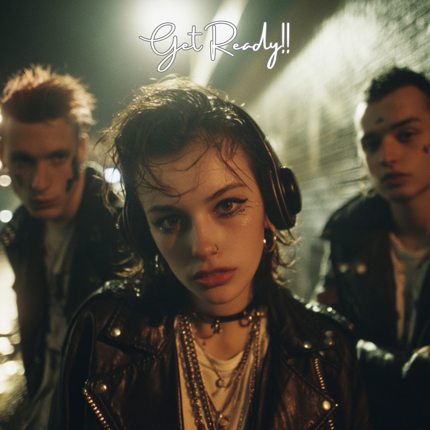 A wild rock ‘n’ roll scream of “Get Ready!” at the very beginning, Funky and energetic 90s-style rock intro, under 25 seconds, Four-piece band: distorted electric guitar with pick scratch, slap bass groove, tight and bouncy drums, Raw and dry live sound, Male vocals only for the scream, No lyrics, just instrumental, Punchy, stylish, and full of attitude