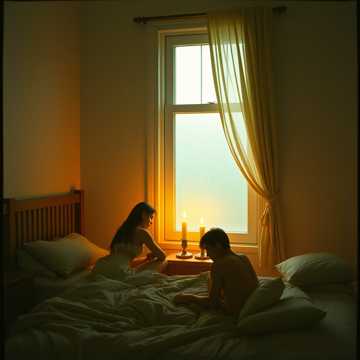 1973 Soft Rock, candlelit bedroom glow, warm Rhodes with soft tremolo, nylon-string acoustic fingerpicking, barely-there brushed drums, fretless bass breathing, intimate three-part harmonies like Bread at 3 a, m, faint Mellotron flutes, distant thunder, 70 BPM, key of C major drifting to E♭ major