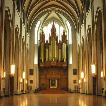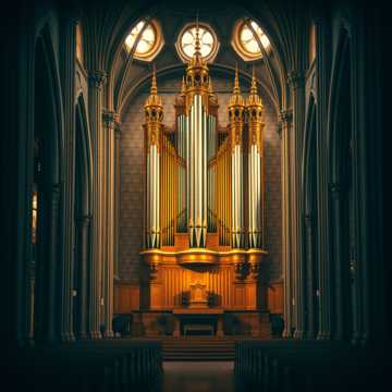 A classical organ piece with a slow tempo and a majestic, reverent mood, The instrumentation is solely a pipe organ, utilizing a variety of stops to create different timbres and dynamics, The piece features a clear, sustained melody in the upper register, supported by rich, harmonized chords in the middle and lower registers, The harmony is largely diatonic, with occasional chromatic passing tones that add color, The dynamics shift gradually, building to a fuller sound and then receding, The overall structure is through-composed, with a continuous flow of musical ideas rather than distinct verse-chorus sections, The reverb is natural, suggesting a large acoustic space like a cathedral