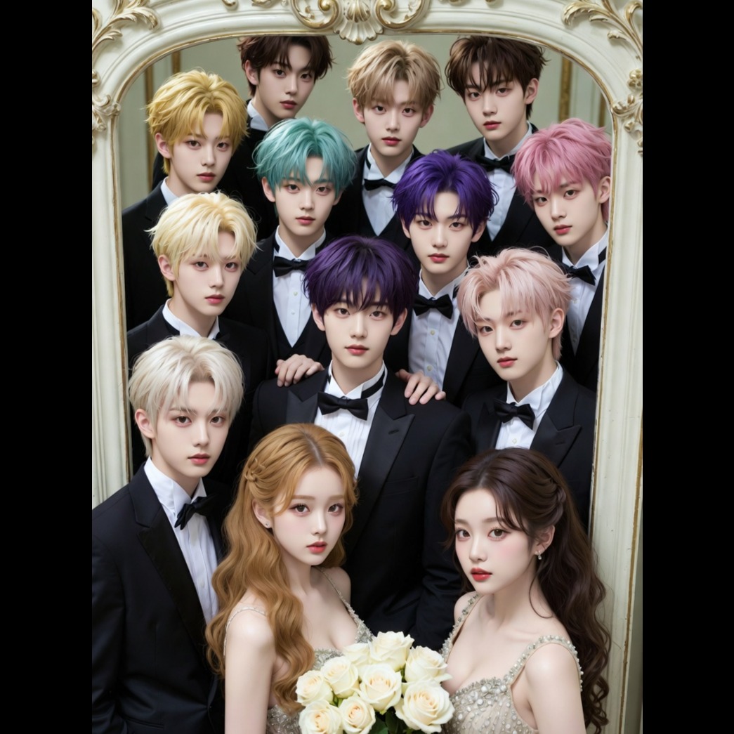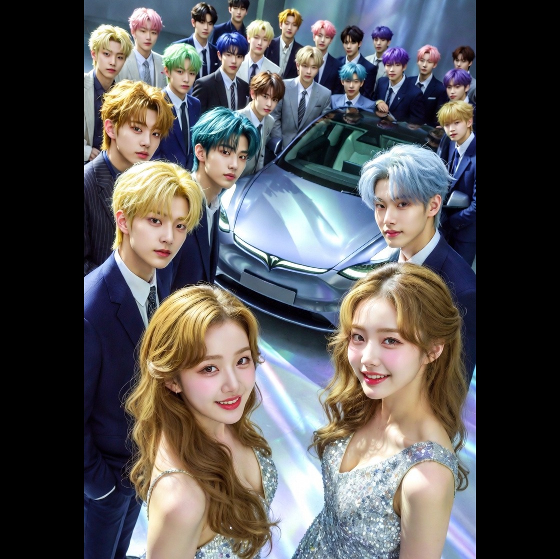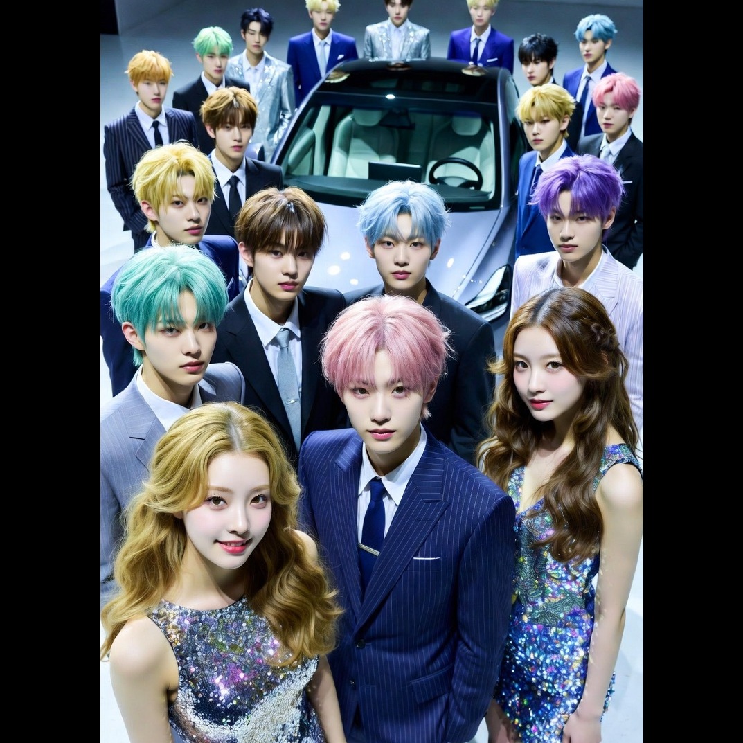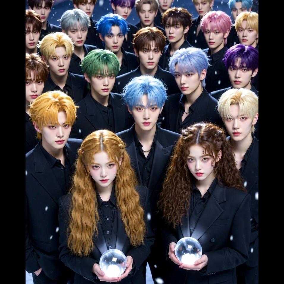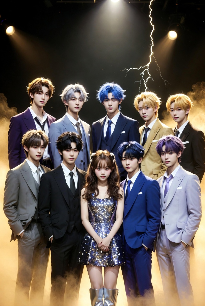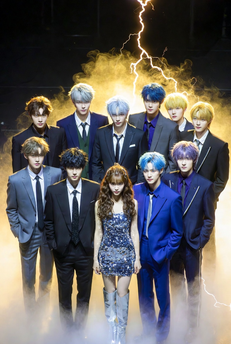 K-Pop, Synth Pop, Energetic Dance, 128 BPM, Vocal Arrangement: Male Group Lead Vocals (Ensemble), Female Solo Hook (High Energy Accent), Pulsing Synth Bass, Heavy Electronic Beats