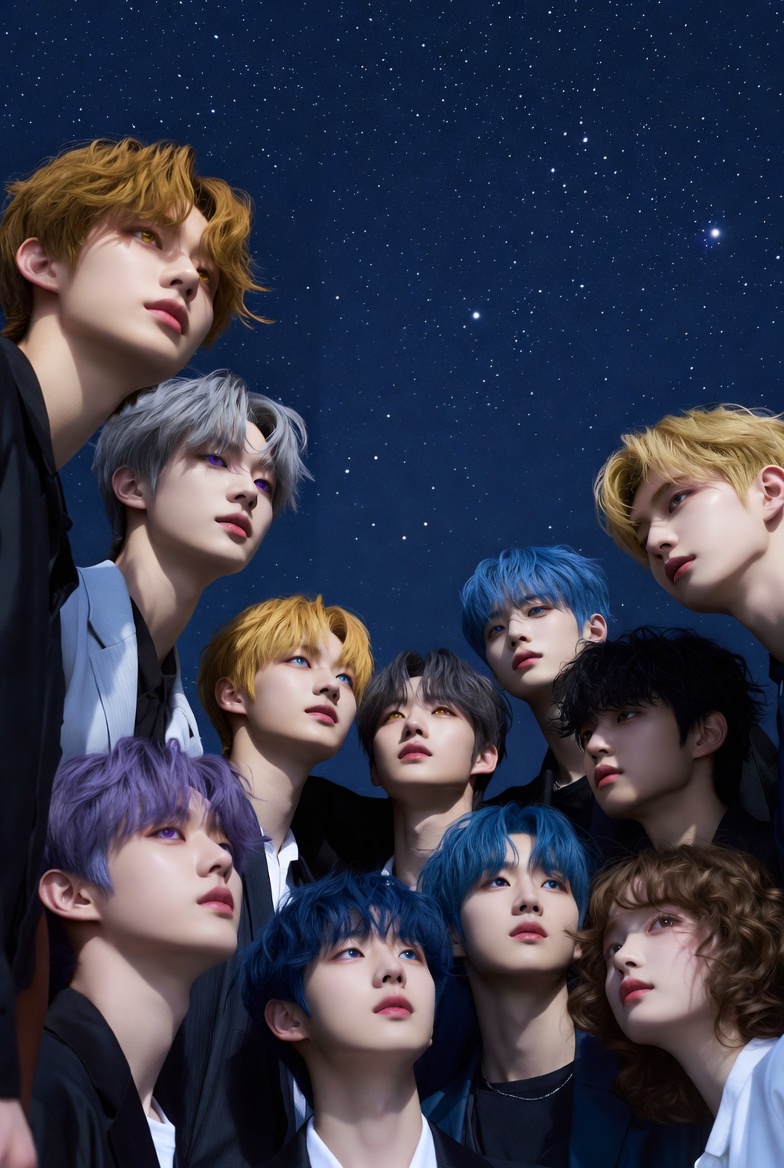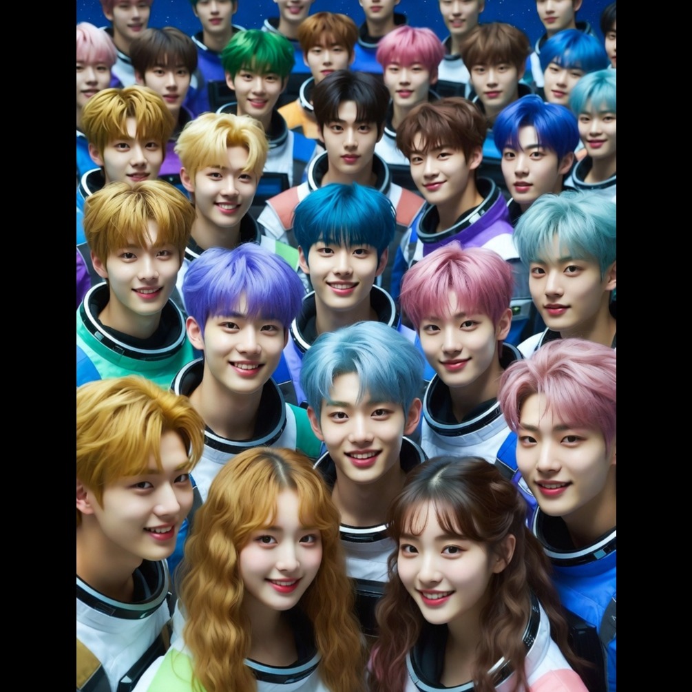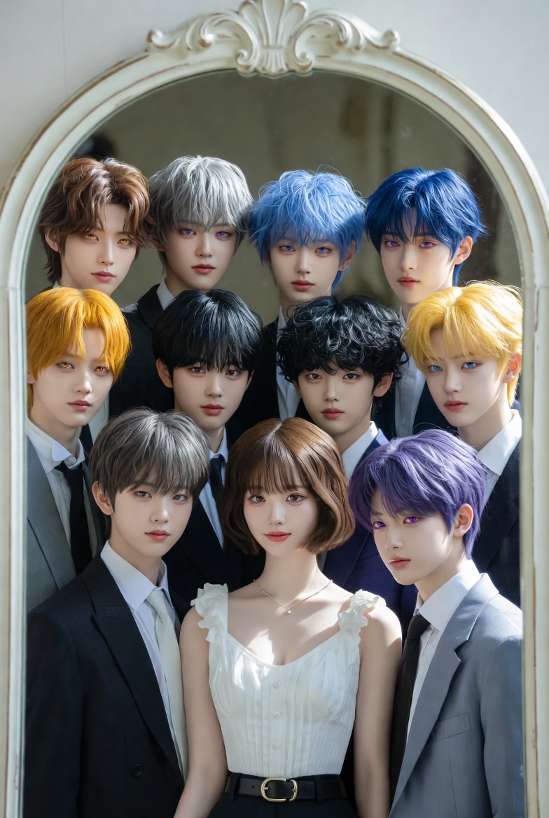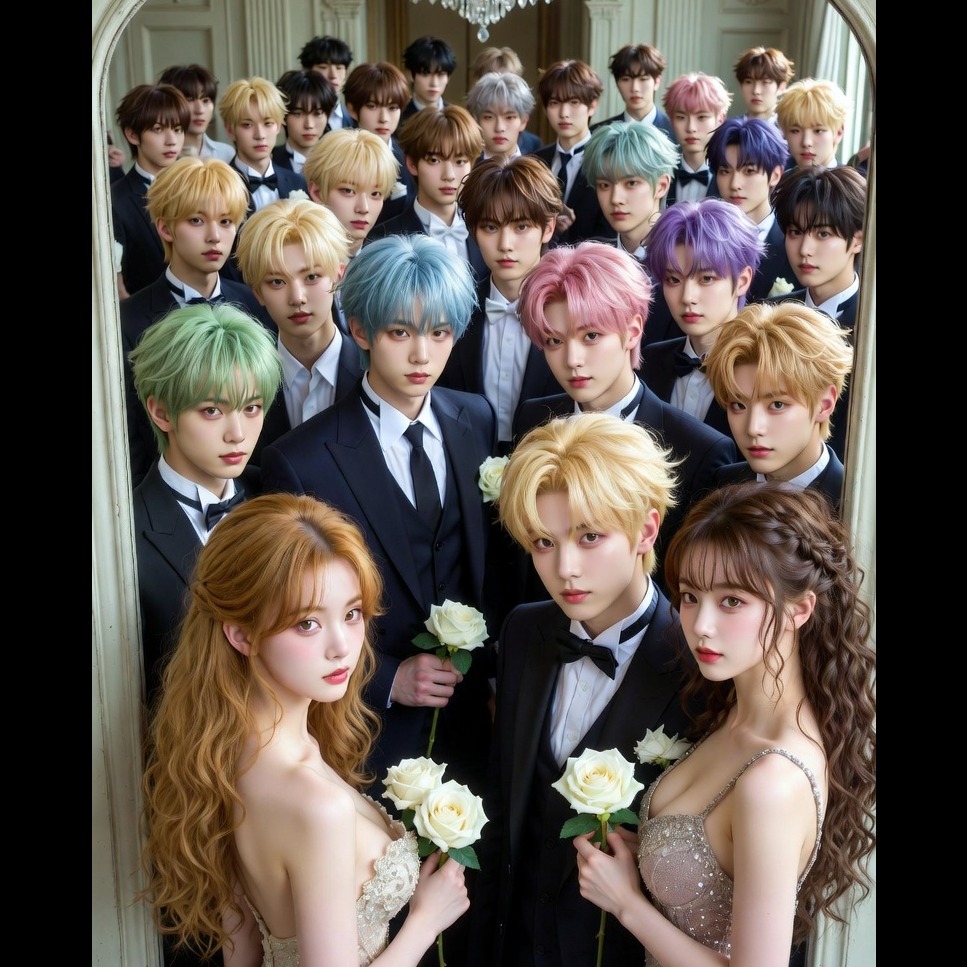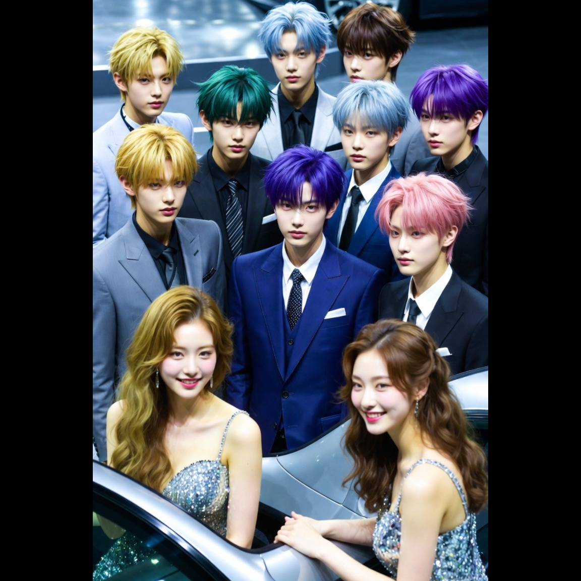 K-Pop, Synth Pop, Energetic Dance, 128 BPM, Vocal Arrangement: Male Group Lead Vocals (Ensemble), Female Solo Hook (High Energy Accent), Pulsing Synth Bass, Heavy Electronic Beats
