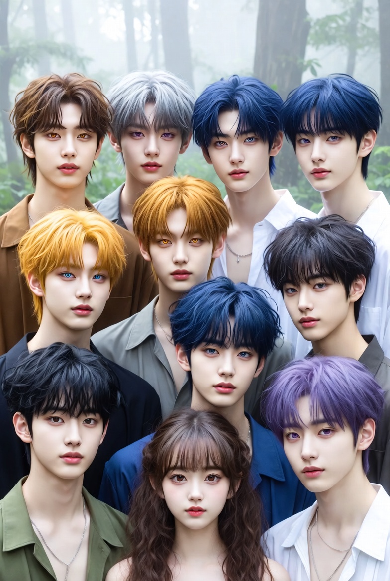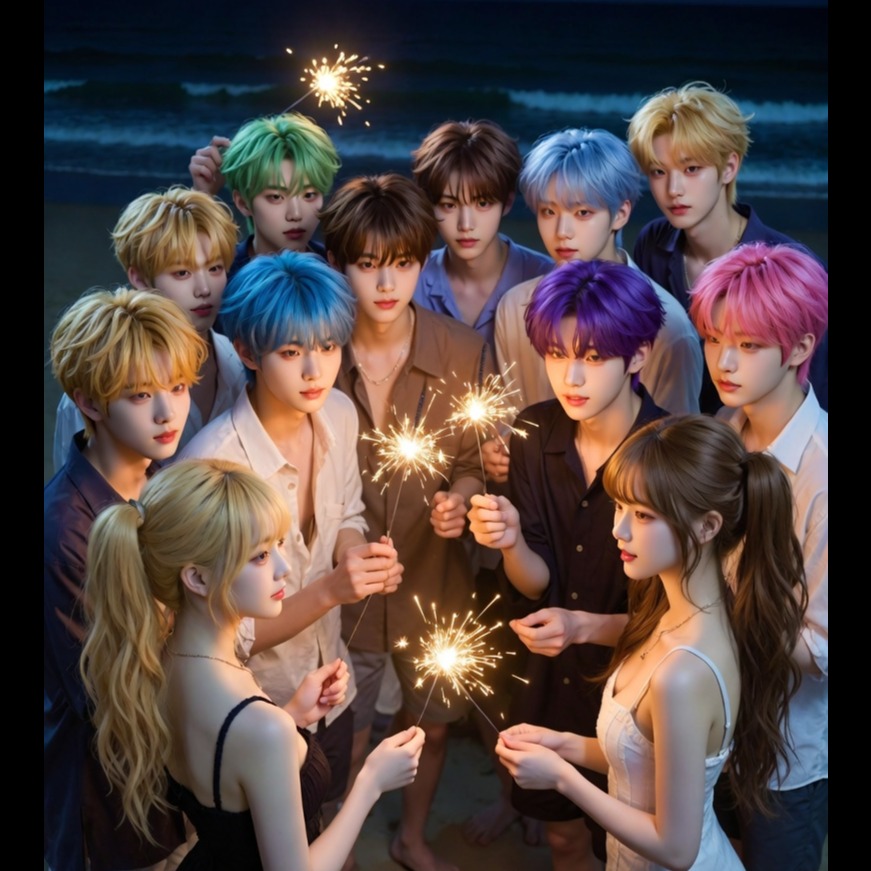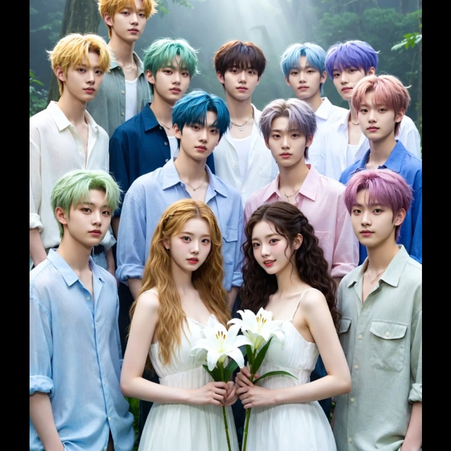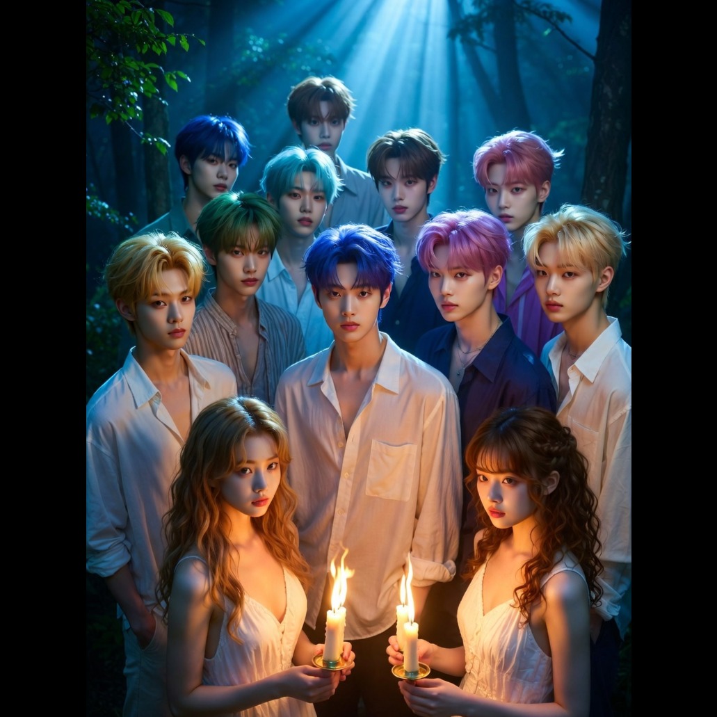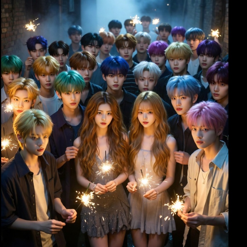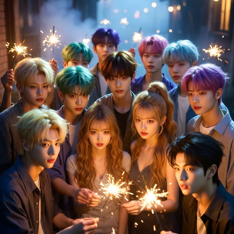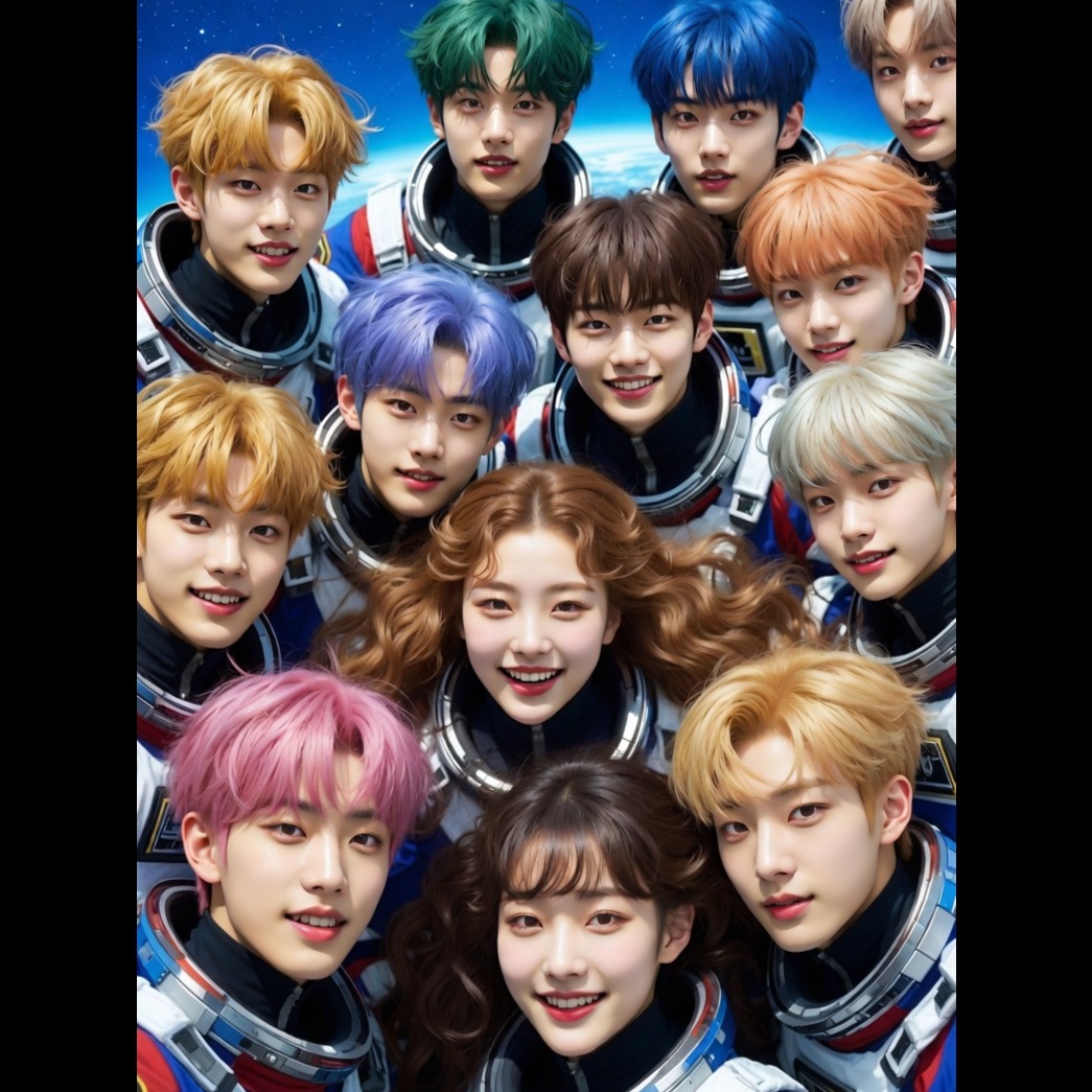K-Pop, Synth Pop, Energetic Dance, 128 BPM, Vocal Arrangement: Male Group Lead Vocals (Ensemble), Female Solo Hook (High Energy Accent), Pulsing Synth Bass, Heavy Electronic Beats