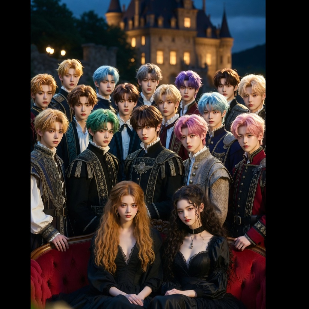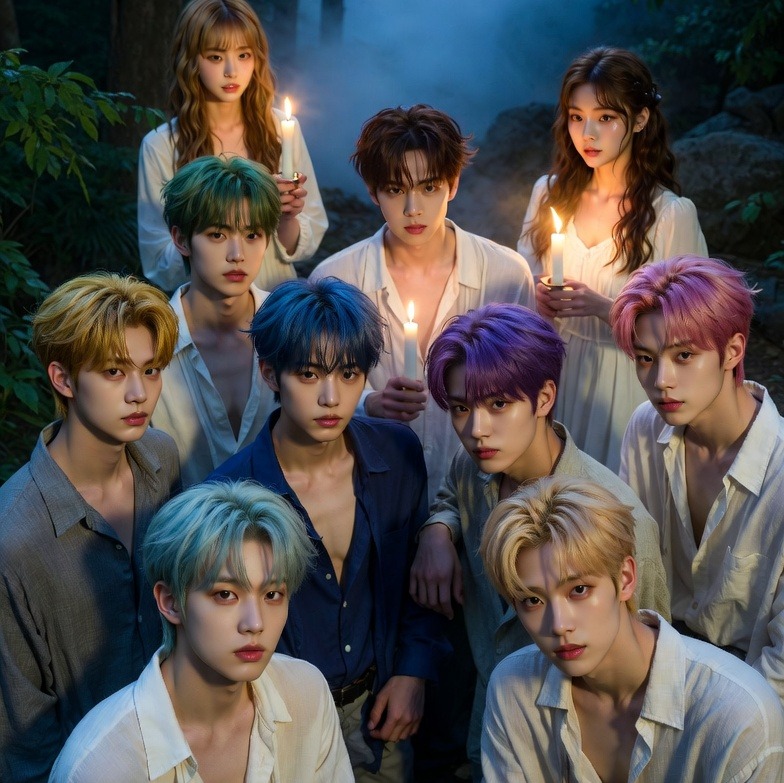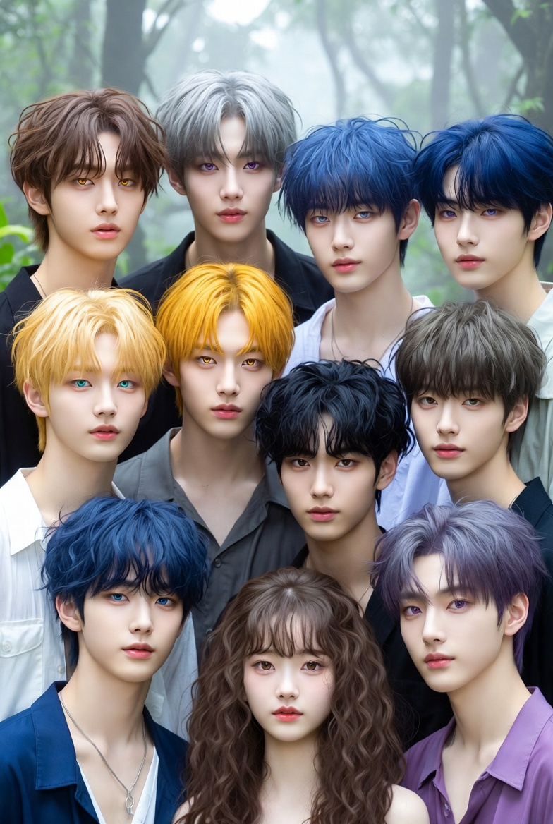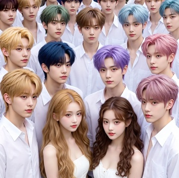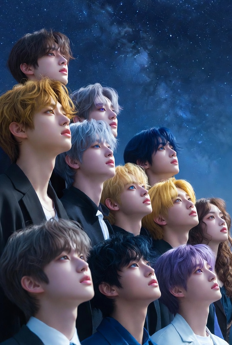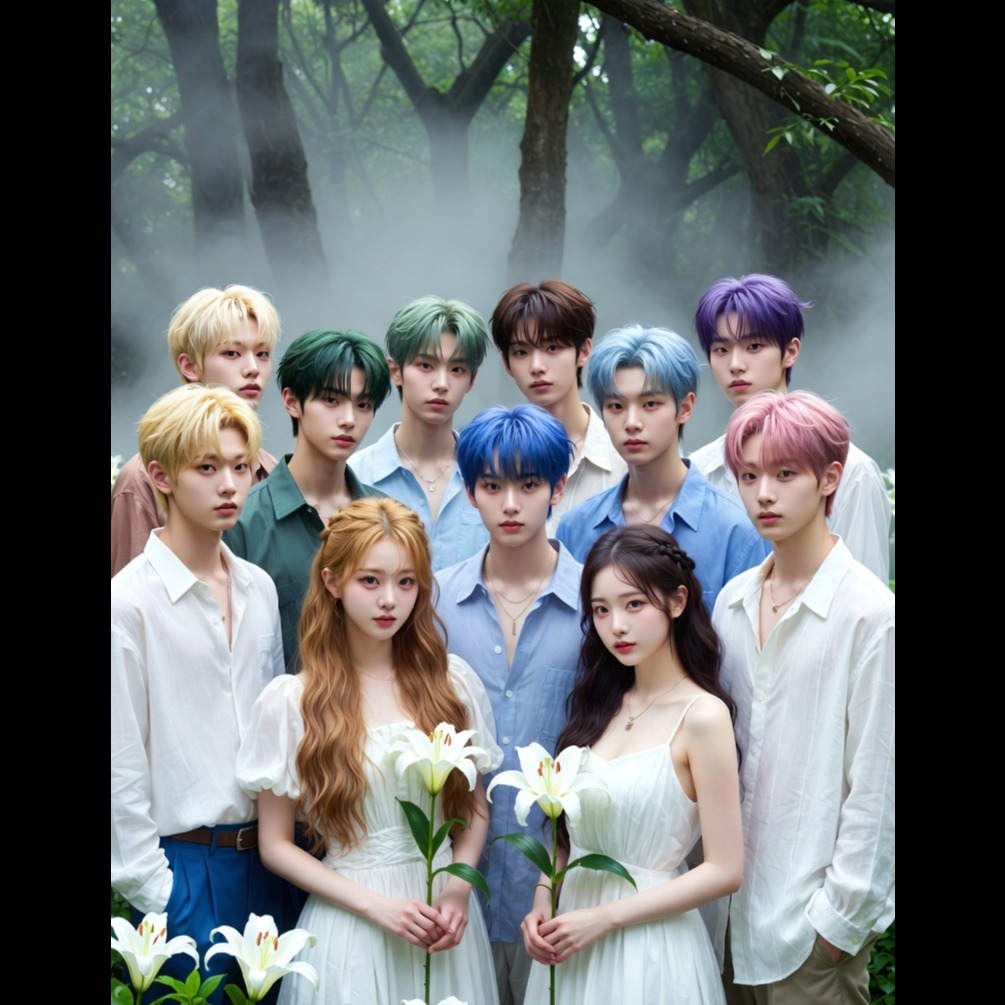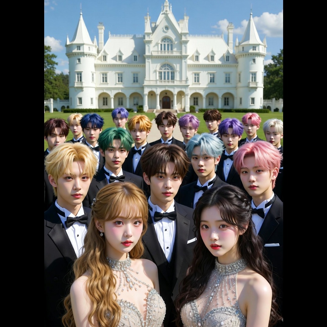 K-Pop, Synth Pop, Energetic Dance, 128 BPM, Vocal Arrangement: Male Group Lead Vocals (Ensemble), Female Solo Hook (High Energy Accent), Pulsing Synth Bass, Heavy Electronic Beats