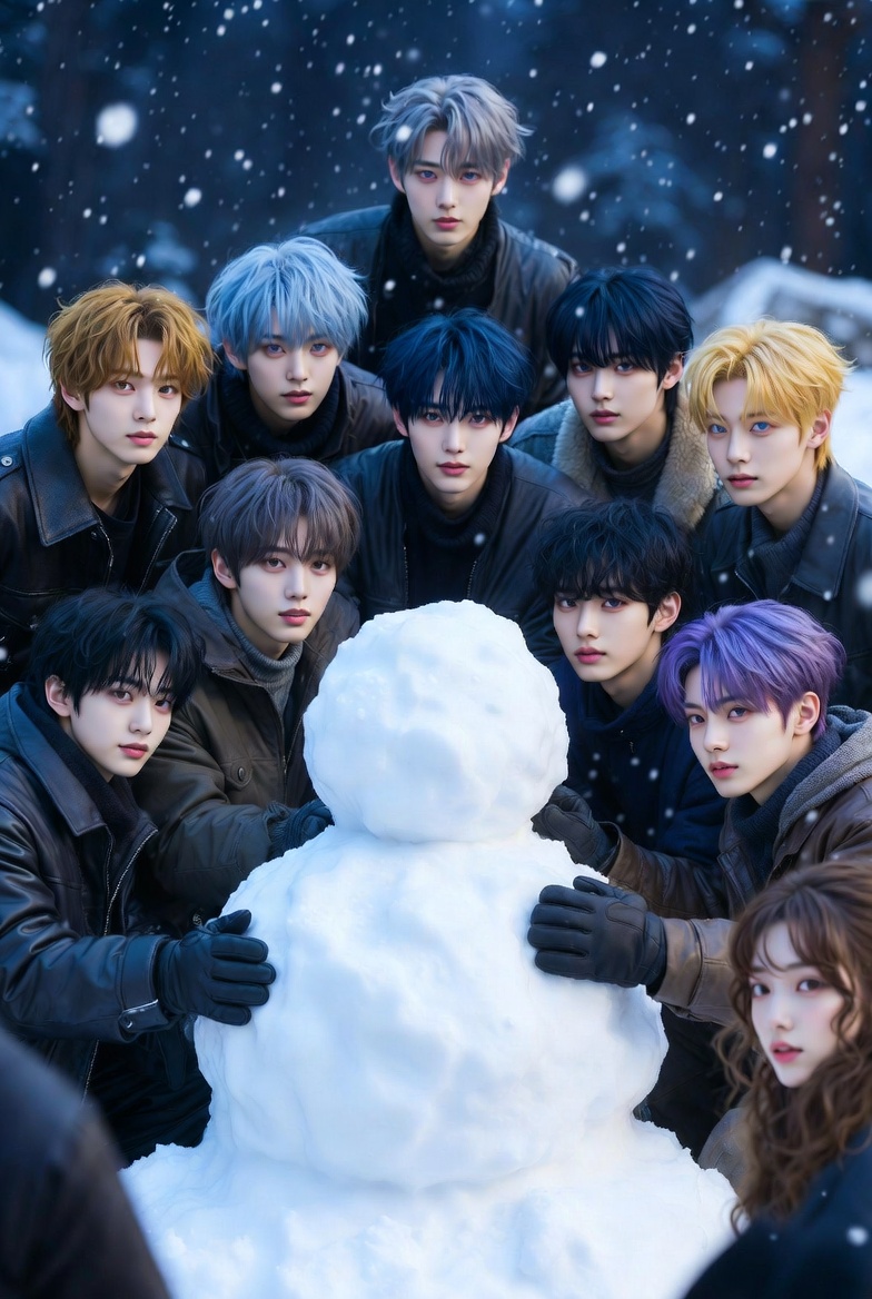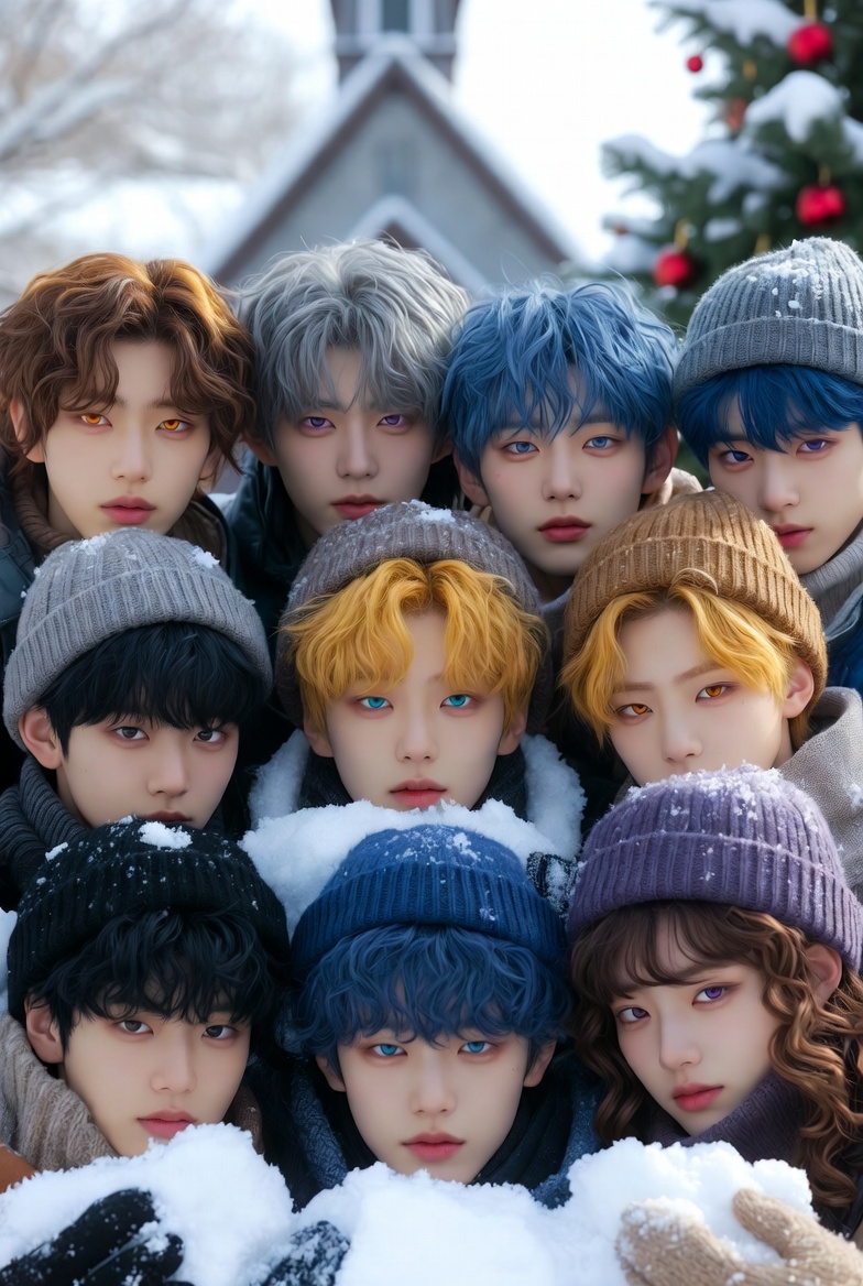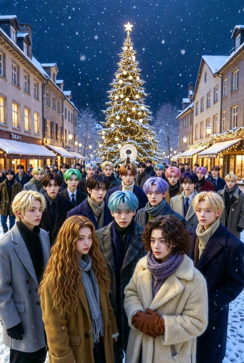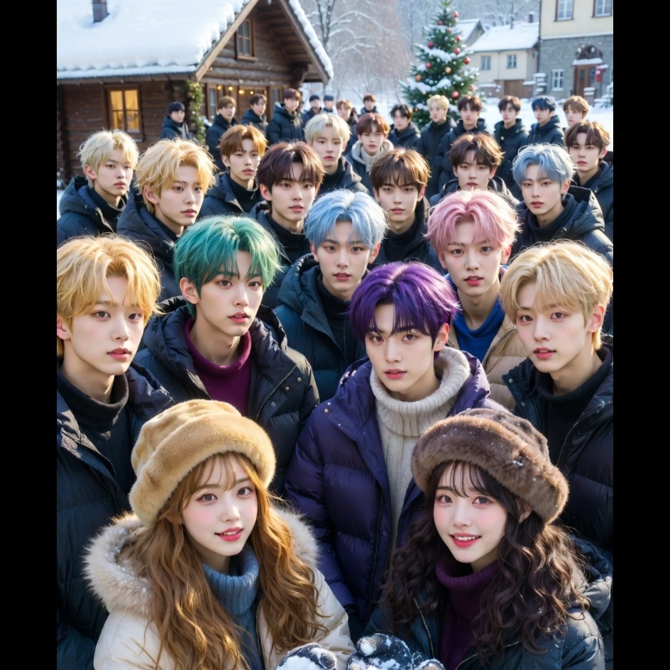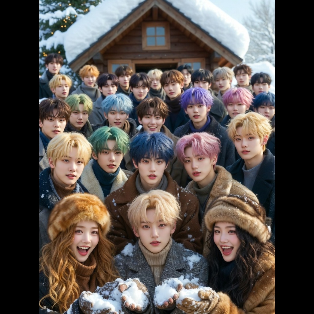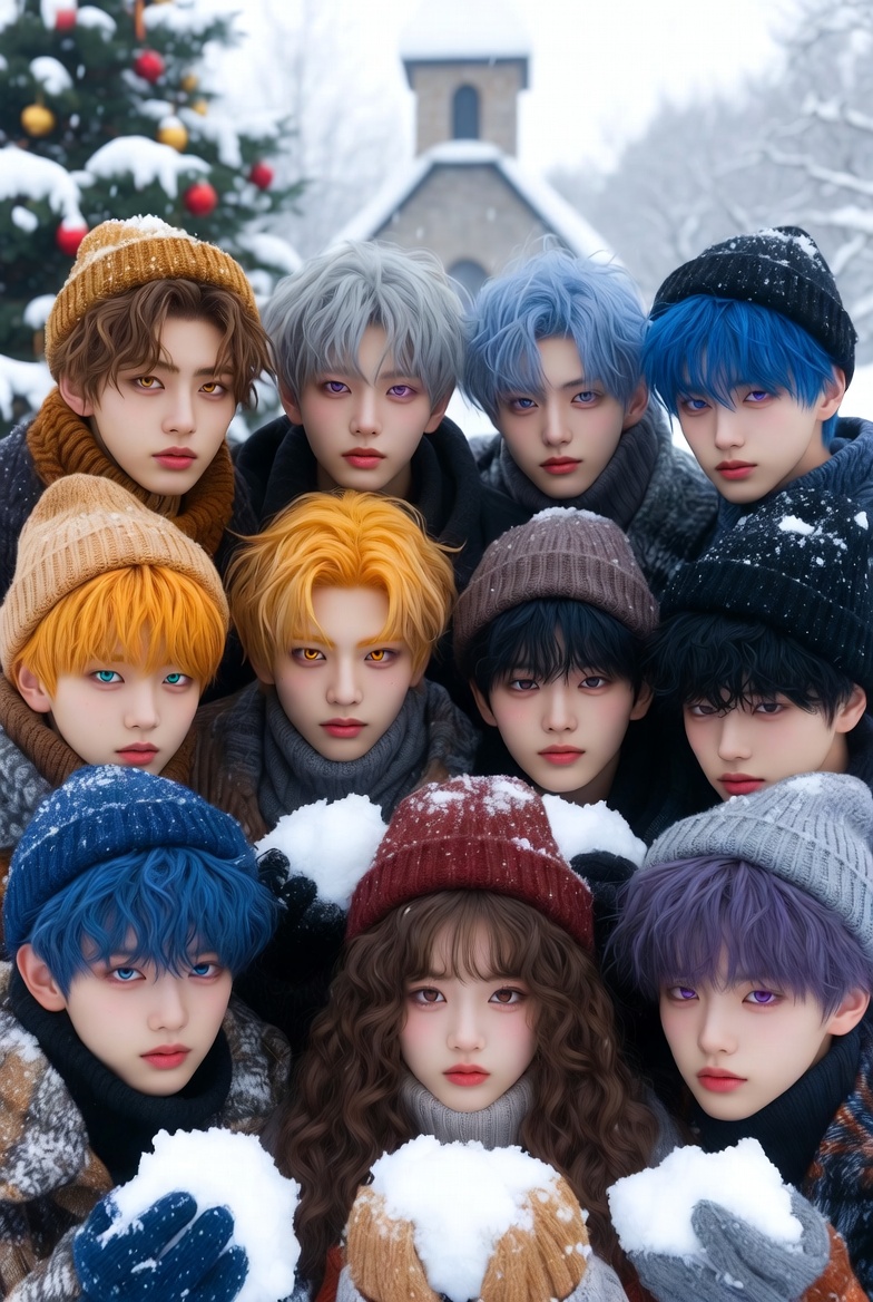 K-pop Winter Pop Ballad, Sweet Romance, 108 BPM, Vocal Arrangement: Male Group Harmony & Female Solo (Soft Bell Tone), Piano, Strings, Chimes, Soft Percussion