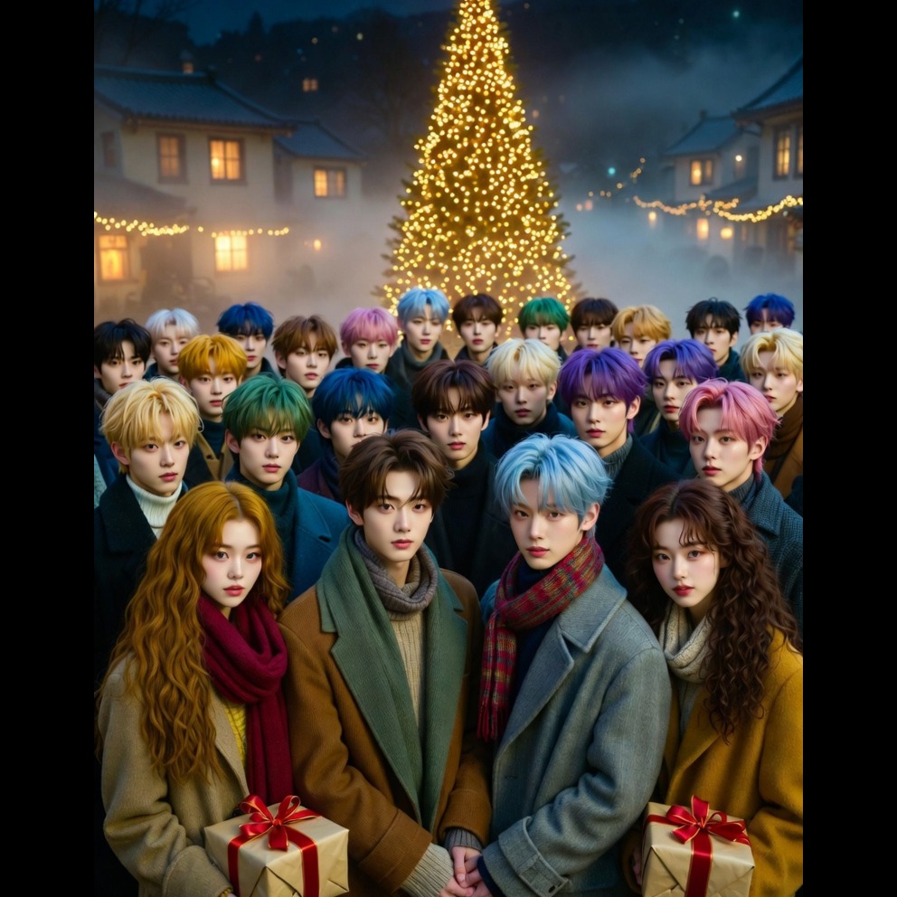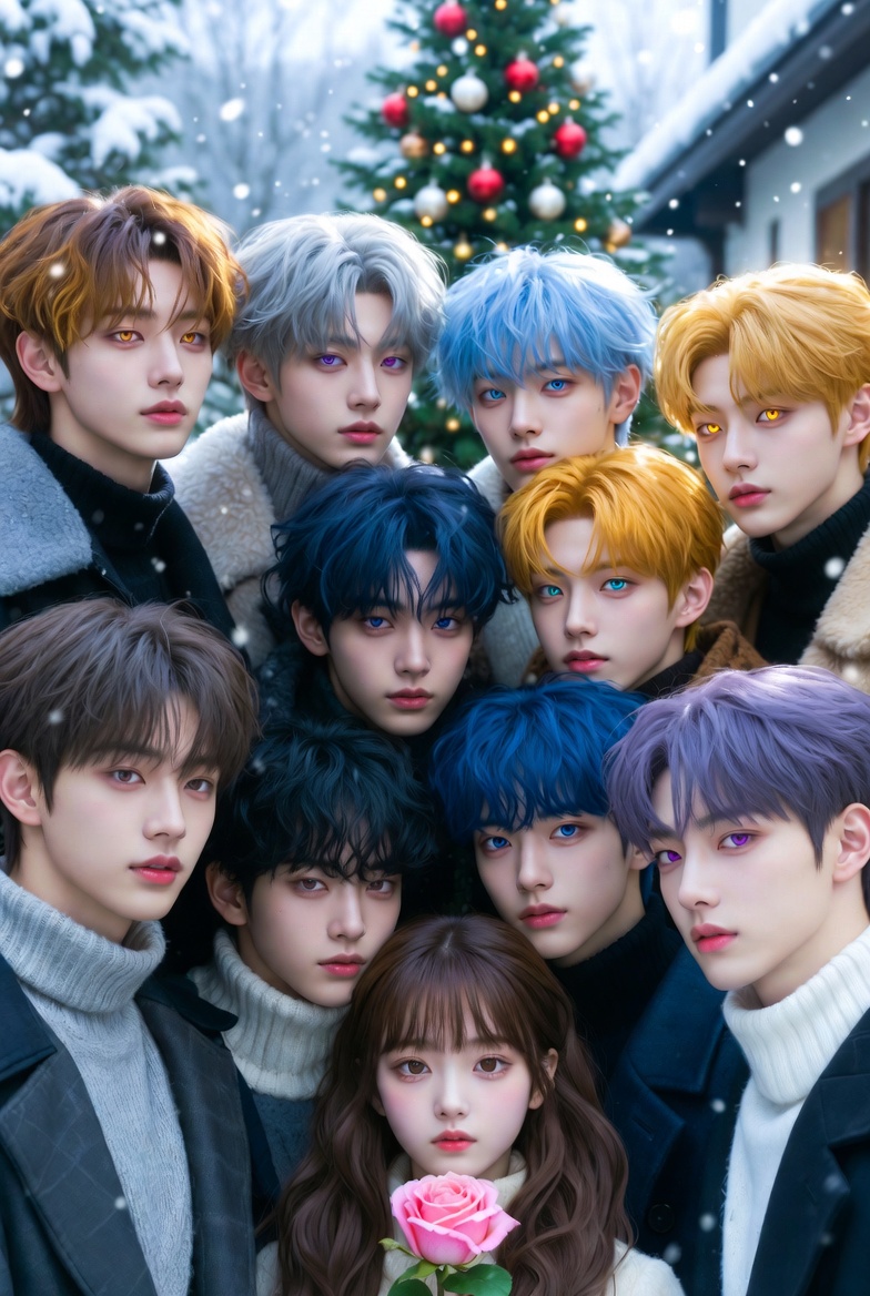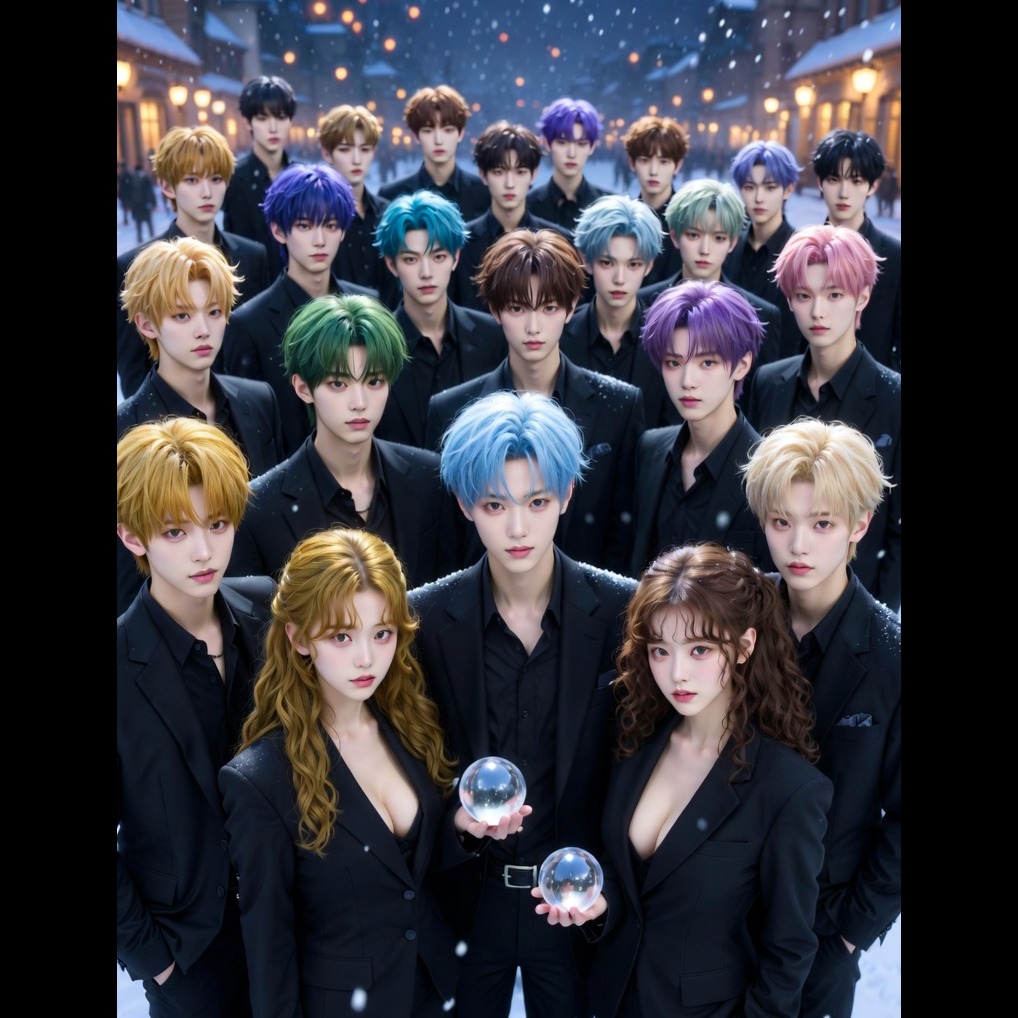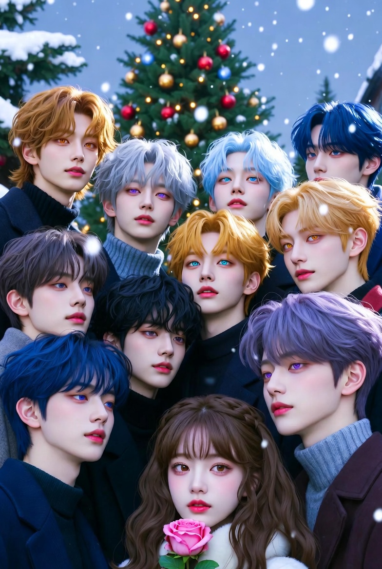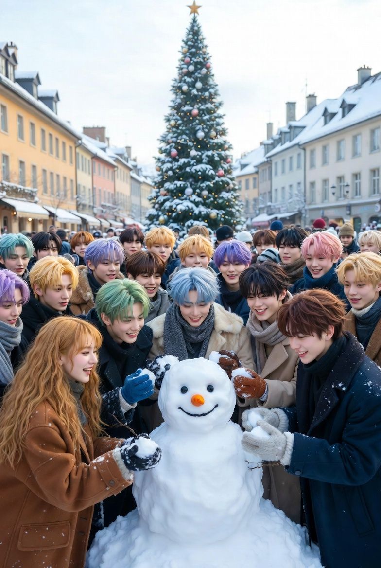 K-pop Winter Pop Ballad, Sweet Romance, 108 BPM, Vocal Arrangement: Male Group Harmony & Female Solo (Soft Bell Tone), Piano, Strings, Chimes, Soft Percussion