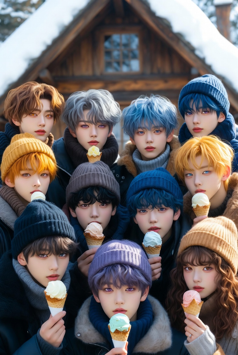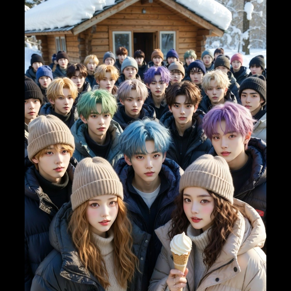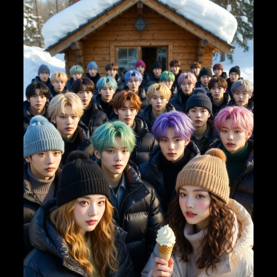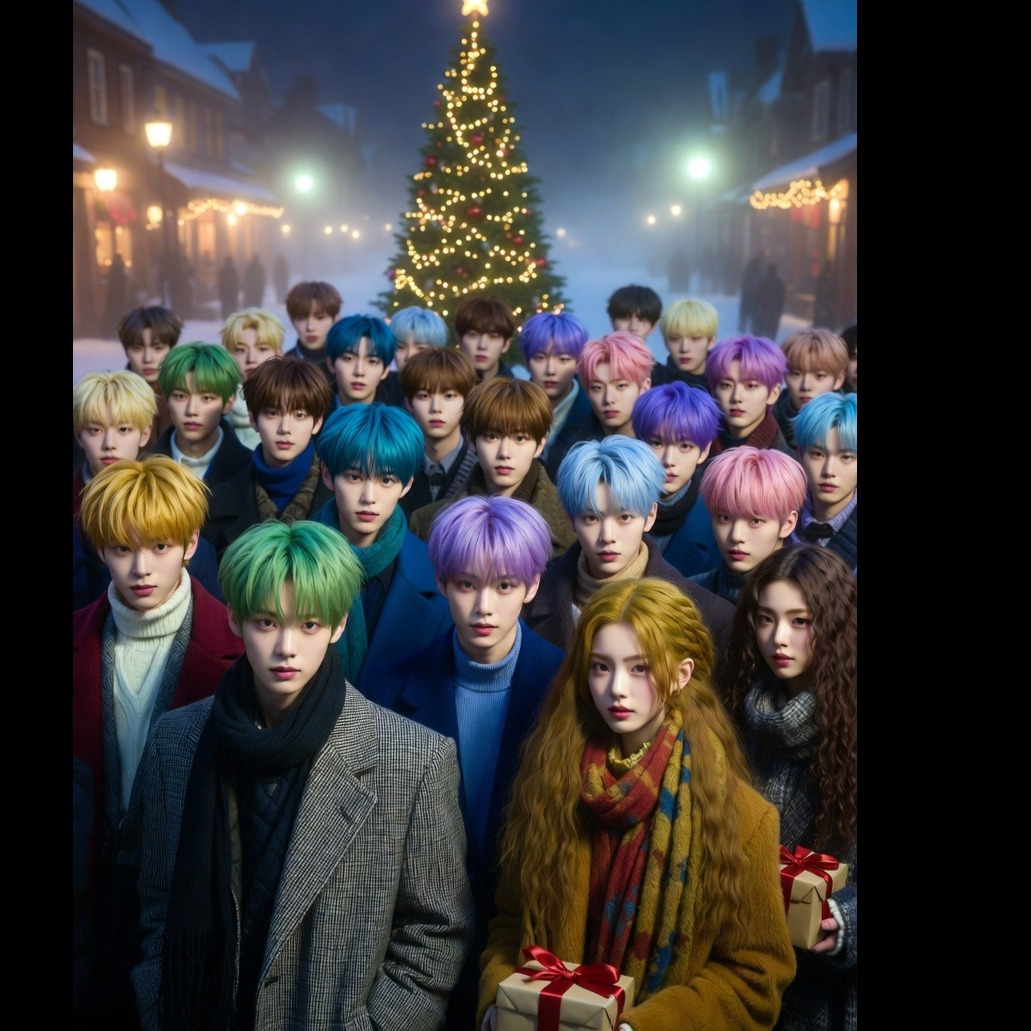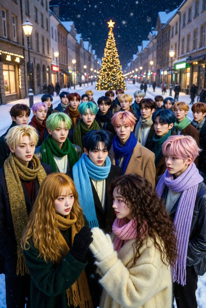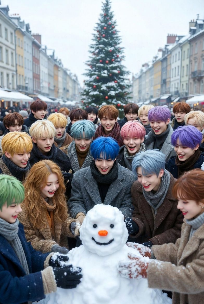 K-pop Winter Pop Ballad, Sweet Romance, 108 BPM, Vocal Arrangement: Male Group Harmony & Female Solo (Soft Bell Tone), Piano, Strings, Chimes, Soft Percussion