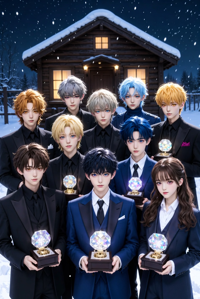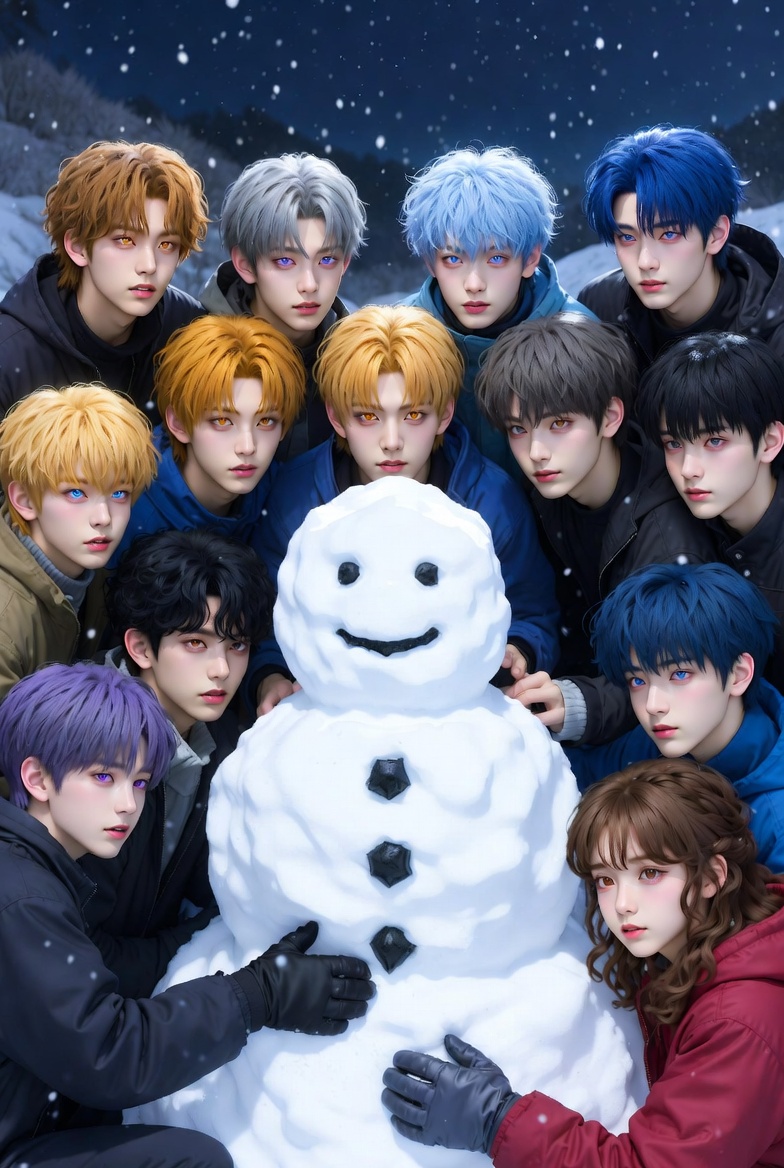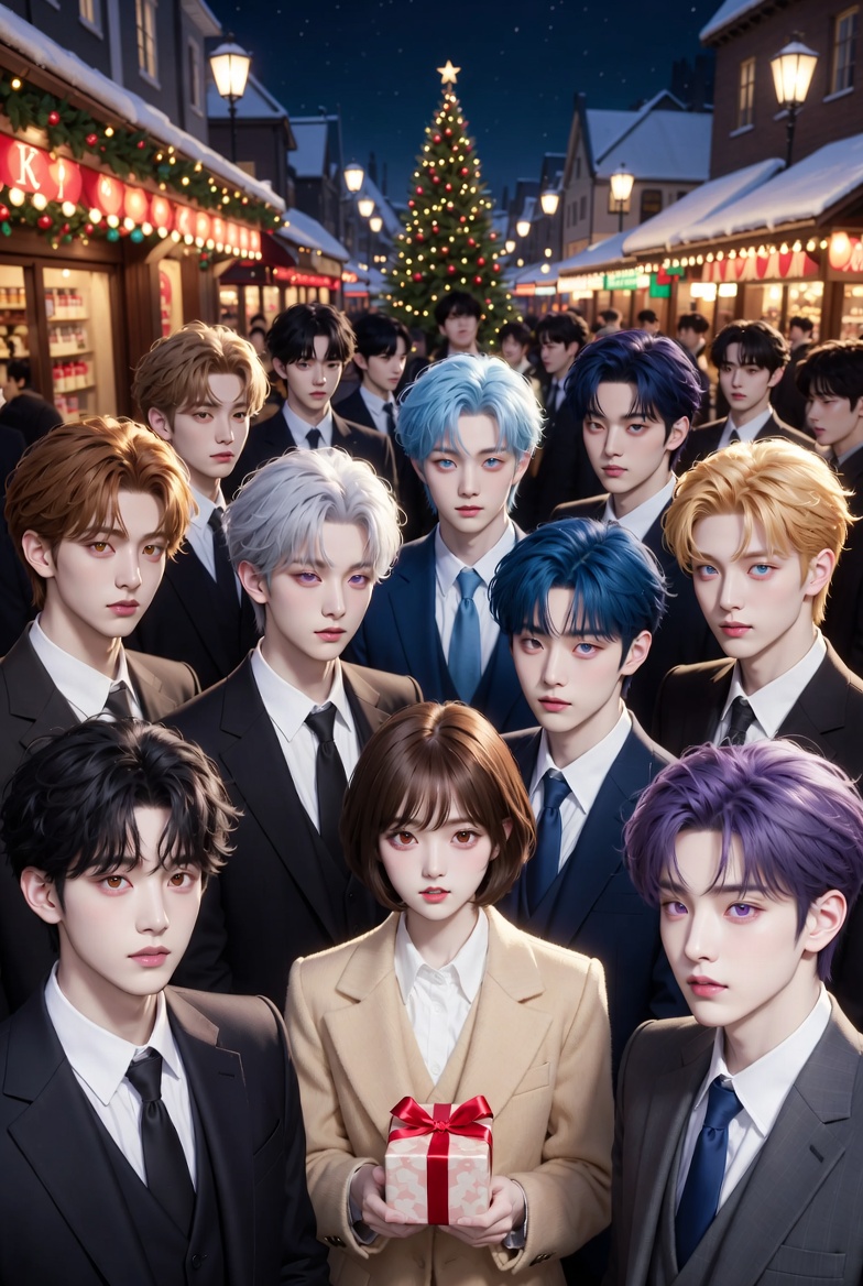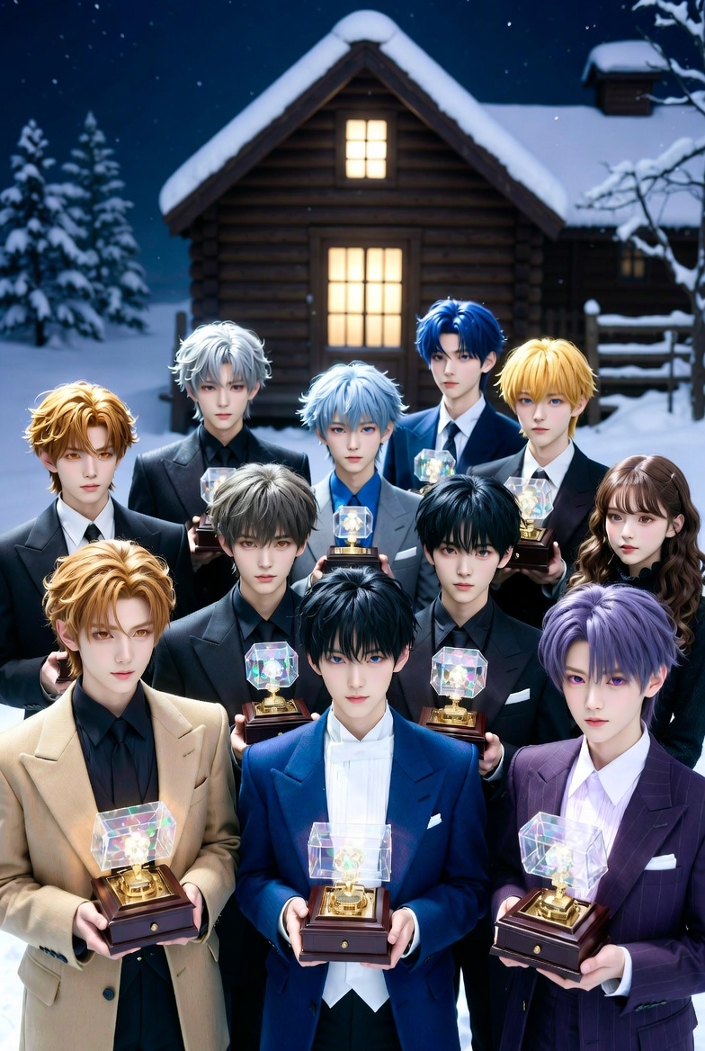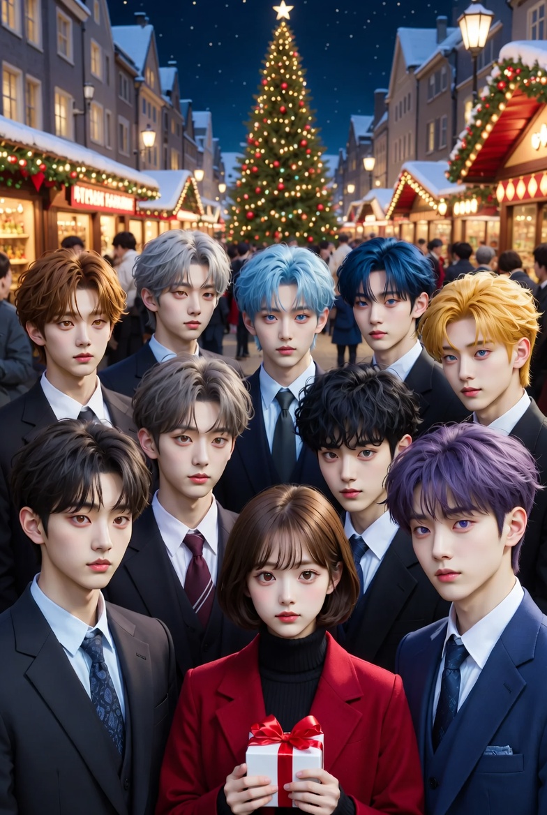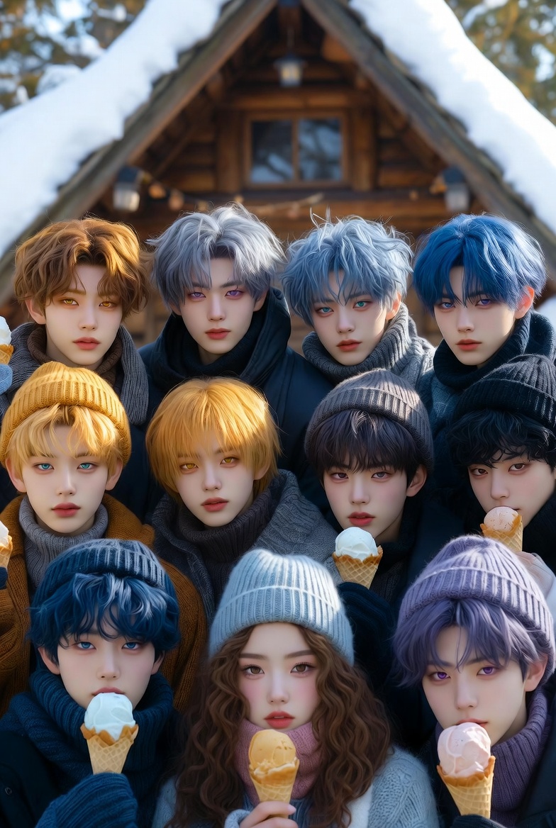 K-pop Winter Pop Ballad, Sweet Romance, 108 BPM, Vocal Arrangement: Male Group Harmony & Female Solo (Soft Bell Tone), Piano, Strings, Chimes, Soft Percussion
