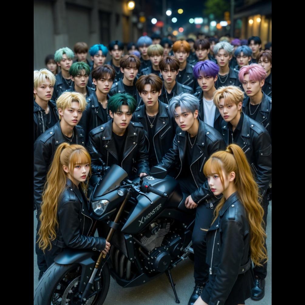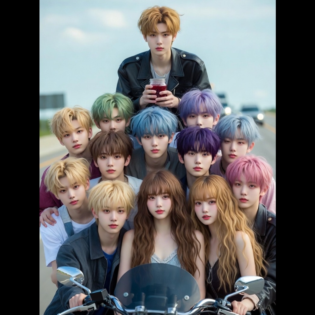 K-pop Hype Anthem, Youth Freedom, 160 BPM, Vocal Arrangement: Male Group Lead + Female Solo Surprise, Distorted Synth, Hyper Bass, Racing Engine Sounds