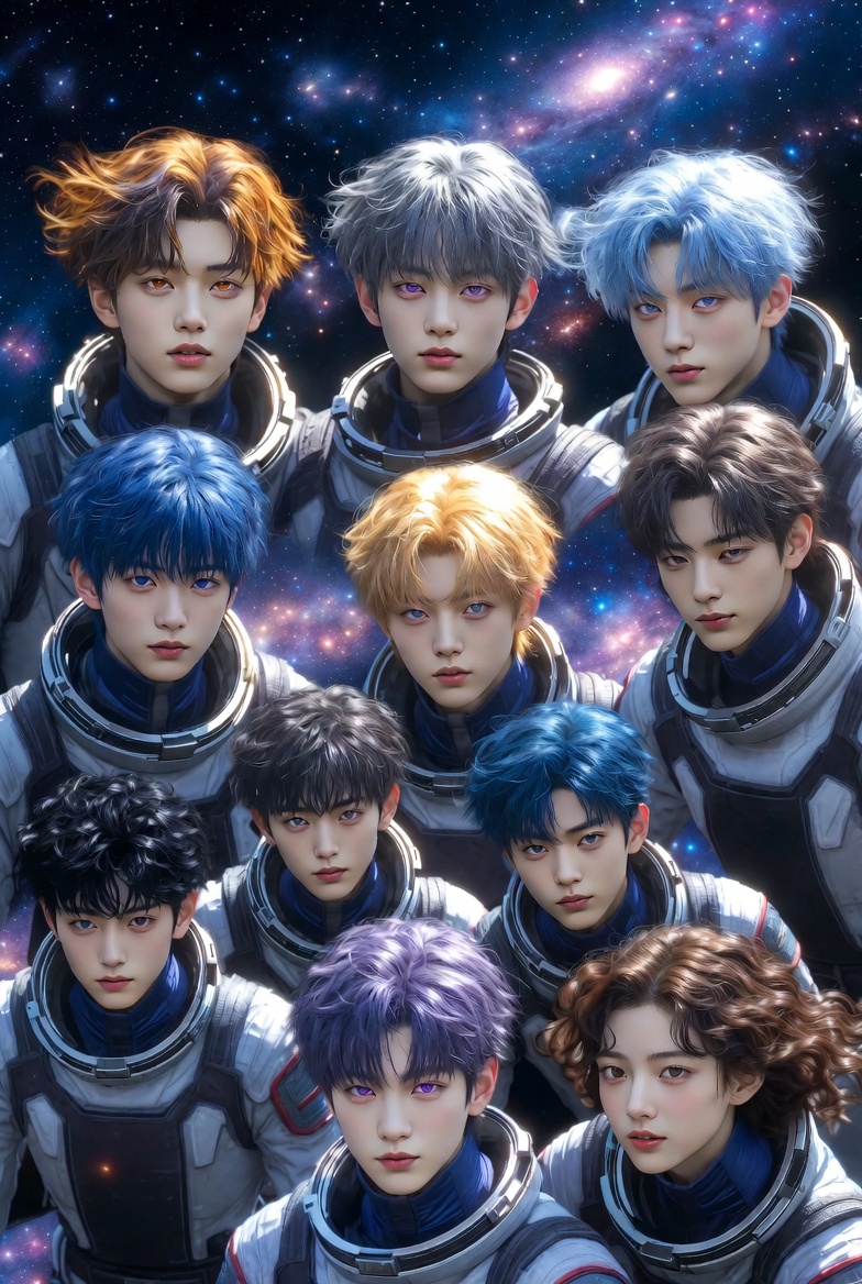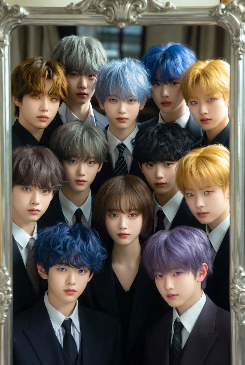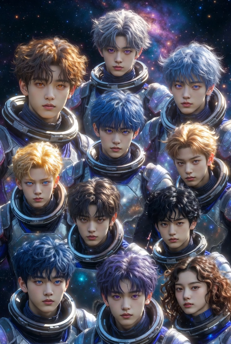 K-Pop, Synth Pop, Energetic Dance, 128 BPM, Vocal Arrangement: Male Group Lead Vocals (Ensemble/Chorus), Female Solo Hook (High Energy Accent), Pulsing Synth Bass, Heavy Electronic Beats, Layered Vocal Harmonies
