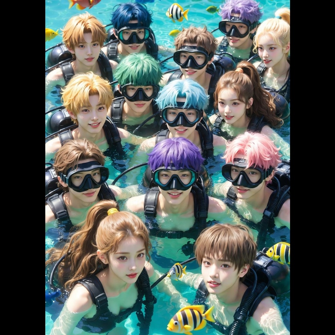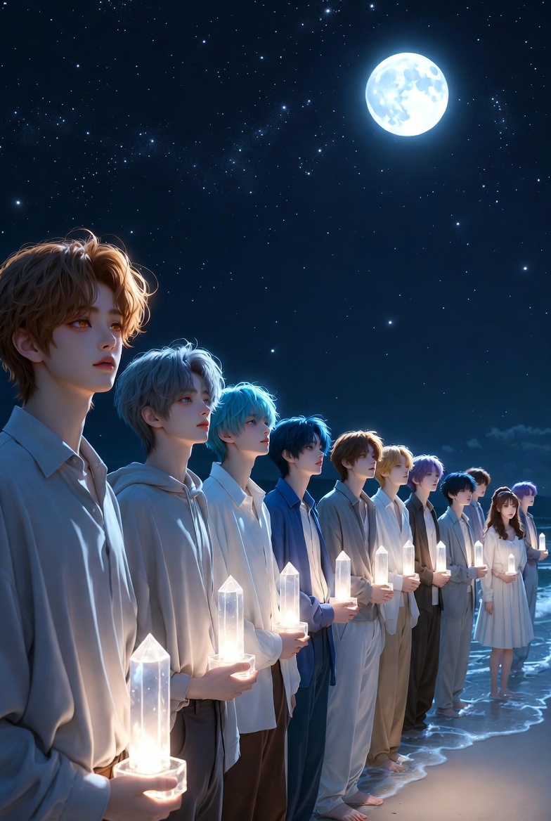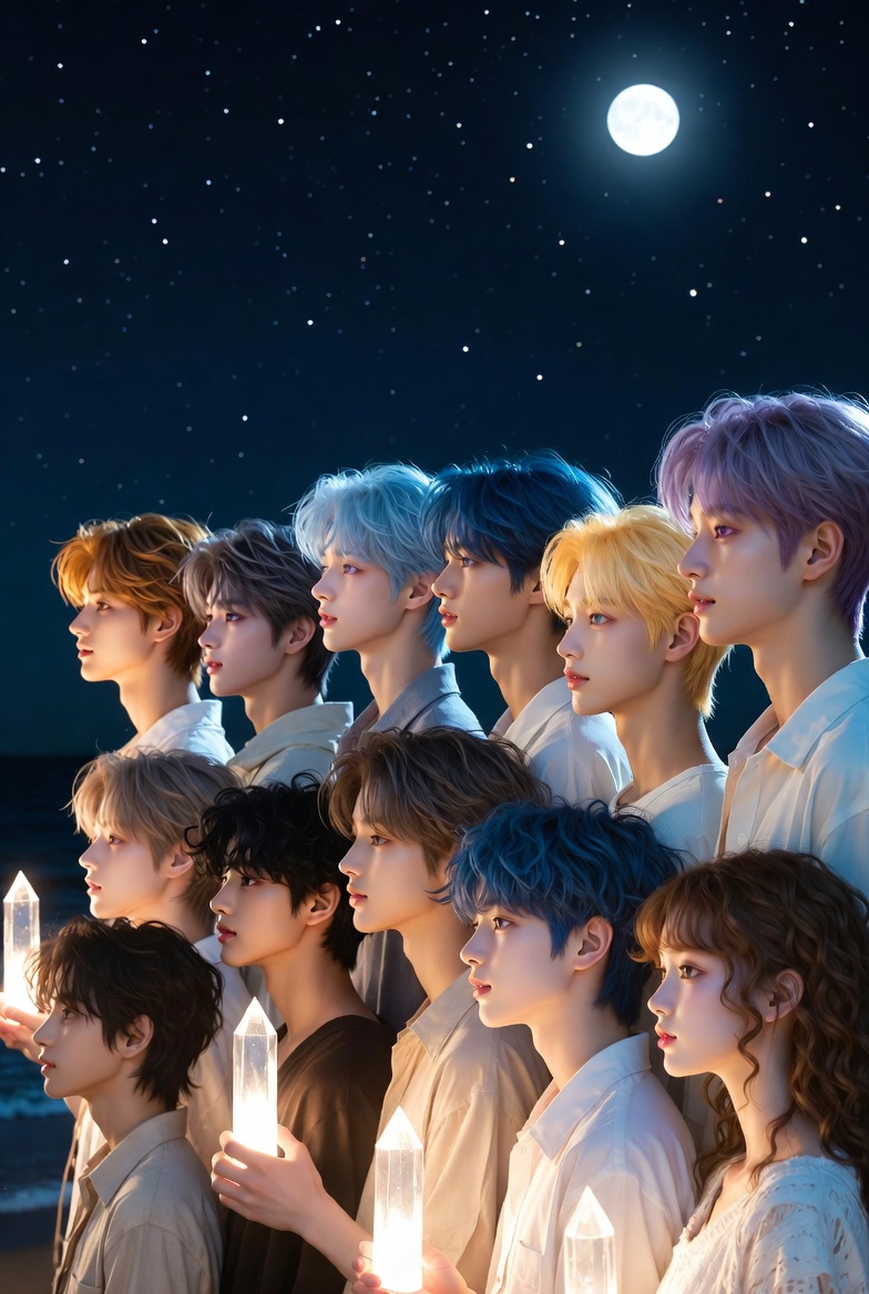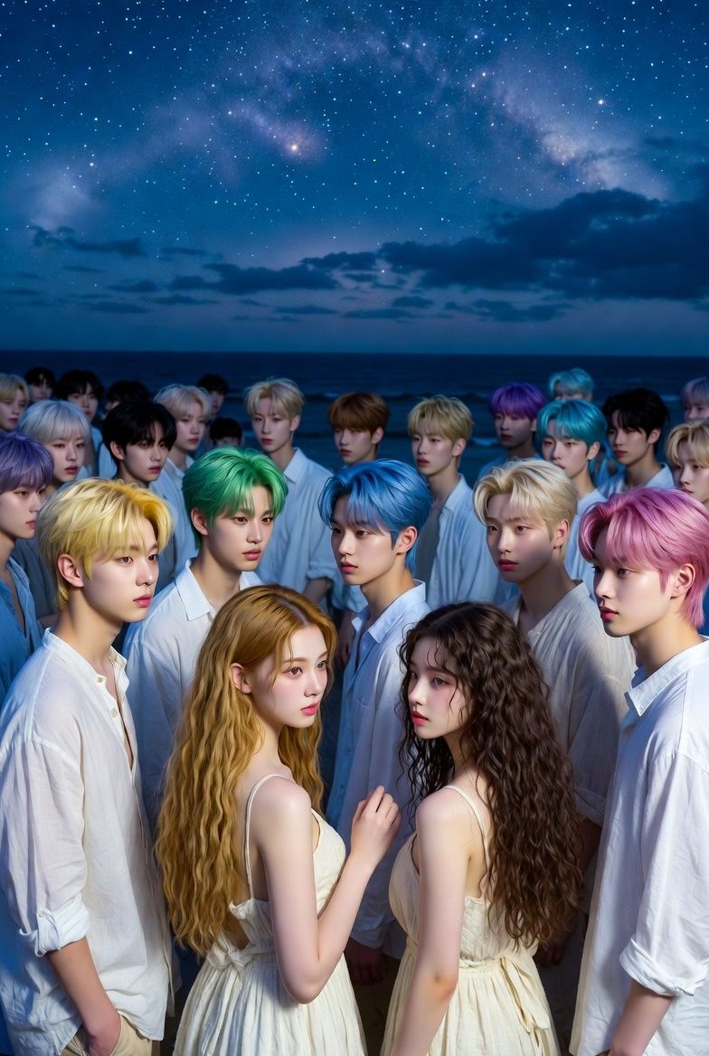 K-pop Ballad, Ocean Romance, 108 BPM, Vocal Arrangement: Male Group Harmony & Female Solo, Acoustic Guitar, Wave Synth, Soft Piano Swells