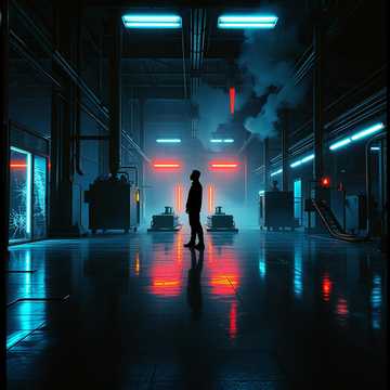 Aggressive EBM and Industrial Metal with distortion-driven riffs and heavy machinery textures, Pounding mechanical rhythms clash with metallic percussion, creating a brutal yet controlled tension, Megaphone-processed vocals deliver assertive lines with a strained edge—projecting strength while letting a subtle vulnerability bleed through the cracks, The sound world fuses factory-floor noise, warped bass sequences, and relentless kinetic energy, forming an atmosphere of defiance and inner conflict, A cold, neon-lit industrial landscape frames the emotional pulse: seven parts hardened resolve, three parts fragile truth