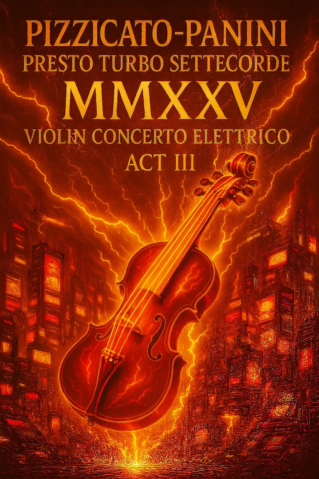 Intro: pp w/ tremolo strings & timpani, crescendos to ff w/ brass & orchestral stabs, Dark, suspenseful texture, Theme: Violin enters ff, bold & fiery, Techniques: rapid arpeggios, broken chords, double stops, ricochet bowing, chromatic runs w/ harmonic glissandi, Develop: Alternates pp & ff, Left-hand pizzicato, spiccato leaps, sul ponticello, building tension w/ cascading runs, Adagio Bridge 1: Lyrical, introspective, pp, swells to mf, fades to p, Vibrato, legato, double-stop melodies w/ trills, ending on harmonic note, II, Allegro Resumption: Returns ff, triumphant, Rapid crossings, trills, ornamented sequences, rhythmic interplay, Adagio Bridge 2: Dreamy, pp orchestral chords, Sul tasto, pizzicato, crescendos into presto, III, Presto Finale: Solo ff, Technique: lightning-fast scales, spiccato, harmonic glissandi, Episodes alternate p & ff, Ends w/ triple-stop chord, fff